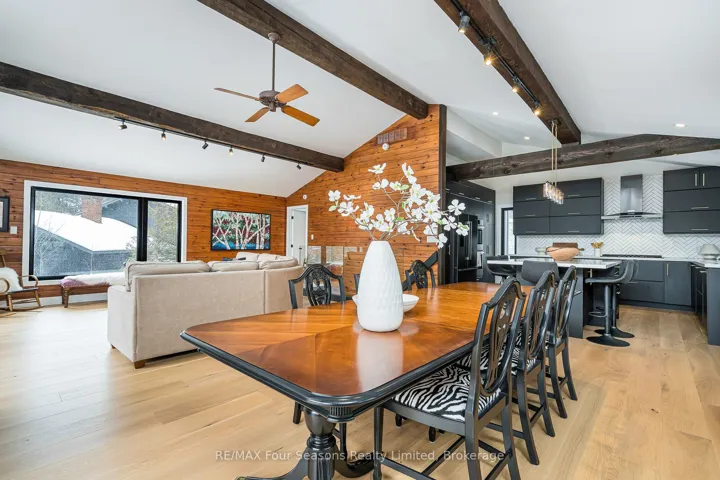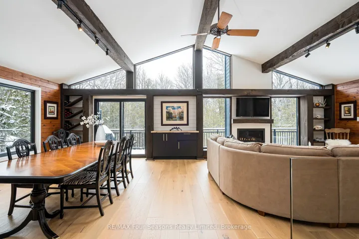 +"PublicRemarks": "Completely renovated in 2022, this exceptional six-bedroom chalet offers the perfect retreat for families, extended families and friends, set on a private lot in the highly sought-after Georgian Woodlands. Designed with family and entertaining in mind, the bright open-concept great room features soaring vaulted ceilings and windows that frame tranquil views where deer can often be seen meandering through the backyard. The spacious layout seamlessly connects the living, dining, and kitchen areas, creating an inviting atmosphere ideal for hosting large family celebrations or relaxed weekends at home. With two possible primary bedrooms on this floor and a second kitchen this thoughtful layout presents an excellent opportunity for an in-law suite or private guest accommodations. The main floor welcomes you with a generous foyer complete with heated floors, two full bathrooms (including one with a sauna for après-ski relaxation), and a cozy family room perfect for movie nights. A walkout leads to a covered deck and hot tub, offering year-round enjoyment in a peaceful, natural setting. The lower level provides additional flexibility with two more bedrooms-one with a private ensuite and the other with a semi-ensuite, along with a large workshop/laundry area. The oversized 2-car garage has a heated floor and access to the 2nd floor suite. Ideally located just a short walk to Craigleith Ski Club and Northwinds Beach on Georgian Bay, and only a 10-minute drive to Collingwood or Thornbury, this beautifully updated chalet delivers the ultimate four-season lifestyle in one of the area's most desirable communities."