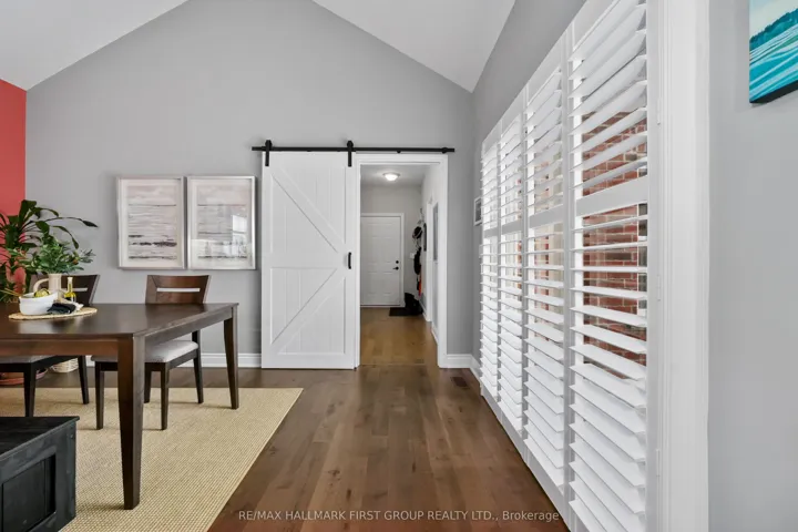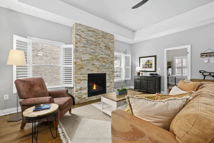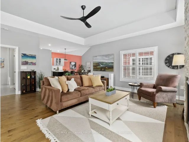 +"PublicRemarks": "Set in the sought-after New Amherst community of Cobourg, this low-maintenance home offers standout curb appeal thanks to its distinctive architectural style and the rear-located driveway and attached double garage. Relax on the front porch that extends the entire width of the house and take in beautiful sunset views at the end of the day. A bright, open front entrance provides ample storage and flows seamlessly into the open-concept principal living space. The living room features a tray ceiling, California shutters, and a cozy gas fireplace with a stone tile surround. The kitchen is both stylish and functional, complete with stainless steel appliances, generous counter and cupboard space, an offset subway tile backsplash, and an island with storage and breakfast bar accented by pendant lighting. Adjacent is the well-appointed dining area with a cathedral ceiling and a walkout to the back deck, perfect for extending your living and entertaining space. The main level includes a spacious primary suite with a tray ceiling detail, a walk-in closet, and an ensuite bathroom with a glass shower enclosure. An additional bedroom, full guest bathroom, and a versatile den ideal for a home office or guest room complete this level. The lower level offers a recreation room, office, ample storage and excellent potential to create additional living space. Outside, enjoy an expansive private deck with built-in seating and plenty of room for lounging or alfresco dining. A low-maintenance backyard completes this impressive offering in a highly desirable neighbourhood. Just moments from Northumberland Hills Hospital, Cobourg Beach, and direct access to the 401."