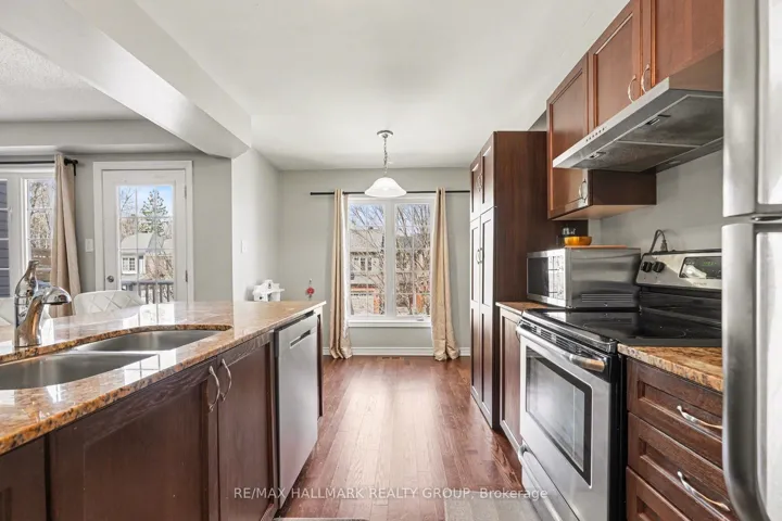 +"PublicRemarks": "Welcome to this practically new and move-in ready stylish end-townhome, built in 2023 and ideally located in a highly desirable neighbourhood backing onto a serene wooded sanctuary. Offering a premium location, this bright and spacious home is filled with natural light from its large windows on two sides of the home.The main floor offers functional design with inside access from the 19 foot garage, a versatile den with the potential to be converted into a bedroom, laundry room with ample storage space and A rare basement level offering 320 sq. ft. of versatile space, perfect for storage or a bright family room with two windows. The second level features a modern open-concept layout with wide plank hardwood flooring, smooth ceilings, and pot lights throughout the kitchen and living areas. The quality upgraded kitchen includes quartz countertops, modern colour cabinetry, soft-close drawers and cabinets, and a stylish backsplash, flowing seamlessly into a cozy dining area and bright living space. Step out onto the large private balcony and enjoy peaceful views of the surrounding greenery perfect for those bird watchers. Upstairs offers well-appointed bedrooms, including a spacious primary suite with a 3-piece ensuite featuring quartz countertops, high cabinetry, and a wall-in glass shower. A full 4-piece main bathroom and an additional 2-piece powder room add convenience. Custom Silhouette blinds and upgraded doors and hardware are found throughout.With quality finishes, a functional layout, a rare basement, and a premium corner location backing onto green space, cozy front porch facing the natural preserve, this home is an exceptional opportunity. This over 2000 square foot home is Perfect for First-Time Buyers and Downsizes."