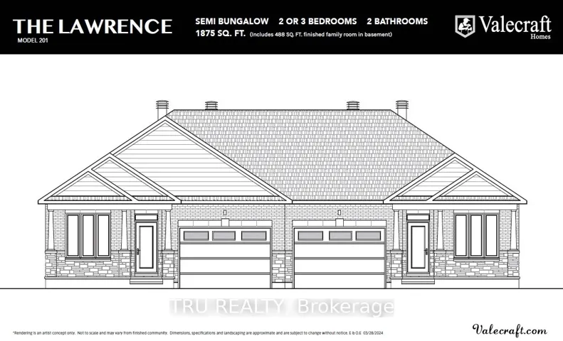 +"PublicRemarks": "Welcome to The Lawrence, a beautifully designed semi-detached bungalow in the stunning new Merkley Oaks community of Iroquois. This home offers the perfect blend of comfort, functionality, and easy main-floor living. The open-concept layout is filled with natural light, highlighted by a rear wall of windows that creates a bright and inviting living space. The main level features 2, ideal for downsizers, retirees, or those seeking single-level living. The finished basement family room, bedroom and 3pc bathroom provides a fantastic additional living space-perfect for guests, hobbies, or extended family. A 1+ car garage and central air conditioning add everyday convenience and comfort. Thoughtfully designed with flexibility in mind, The Lawrence is well suited for a relaxed lifestyle in a welcoming small-town community close to the St. Lawrence River and local amenities. Total living space: 1,875 sq. ft.(Includes 488 sq. ft. finished family room in the basement) ** Note: Photos are from similar model - Please visit the Valecraft Homes sales center for more information **"