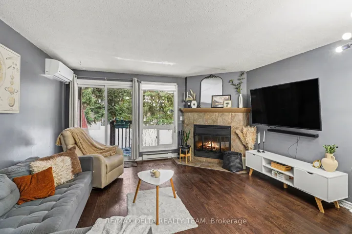 +"PublicRemarks": "This inviting lower-level terrace home combines comfort and convenience in an ideal location. With quick access to Hwy 417 and just steps from the Ottawa River, scenic walking trails, schools, public transit, the future LRT, and everyday amenities, everything you need is close at hand. Inside, recent updates include stylish laminate and tile flooring throughout the main floor. A large front window welcomes an abundance of natural light, enhancing the bright layout that seamlessly connects the kitchen, dining, and living spaces-perfect for both daily living and entertaining. The well-appointed kitchen features generous cabinetry and counter space, stainless steel appliances, and a raised breakfast bar for casual meals. In the living room, a cozy corner wood-burning fireplace adds warmth and charm, while patio doors open to a lovely sitting area ideal setting for relaxing outdoors. The spacious primary bedroom offers wall-to-wall closet space and a large window, and the second bedroom is also generously sized. A full bathroom, in-unit laundry, and additional storage complete the lower level. Mature trees in the neighbourhood provide a peaceful atmosphere. A dedicated single-car parking space and convenient visitor parking are also included. Move-in ready and thoughtfully updated, this home delivers easy, comfortable living in a fantastic setting."