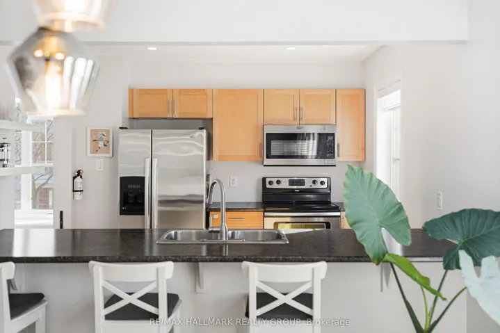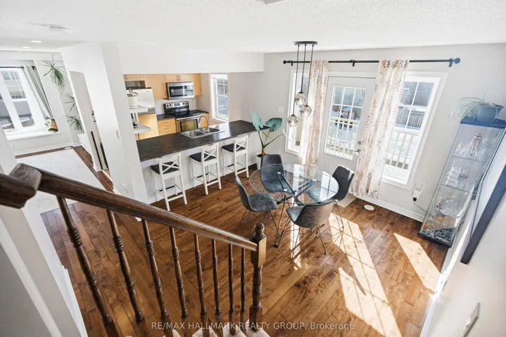 +"PublicRemarks": "OPEN HOUSE - Sunday, March 1st 2:00-4:00PM! Welcome to this bright and well-kept three-storey corner townhome, offering a functional layout and excellent natural light throughout. Enjoy the convenience of an attached garage with direct access to the main level, plus a dedicated main-floor office/den-perfect for working from home.The second level features a spacious living room, a separate dining area, and an open-concept kitchen with walk-out to a south west-facing balcony-ideal for relaxing or entertaining. Hardwood flooring flows through the main living areas, complemented by ceramic tile in the kitchen and powder room, and stylish pot lights in the living space and kitchen.Upstairs, the primary bedroom offers a walk-in closet and a private 3-piece ensuite. The second bedroom features a vaulted ceiling and access to a full 3-piece bathroom. Additional highlights include interlock front parking, stainless steel appliances, pull-out kitchen shelving, central vacuum, and updated light fixtures.Recent updates include a new washer and dryer (2023), hot water tank (2023), kitchen pot lights (2024), microwave/vent (2025), refreshed powder room paint, and ensuite bathroom upgrades including quartz counters, new toilet, and updated tiles (2025). Most windows feature blinds for added privacy and comfort.Conveniently located near Tanger Outlets, grocery stores, restaurants, Canadian Tire Centre, public transit, and with easy access to the Queensway. Situated in a family-friendly community-this home is move-in ready and a must-see!"