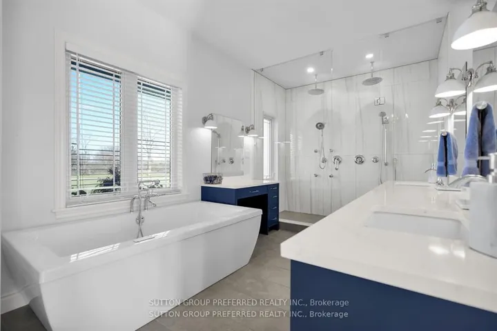 +"PublicRemarks": "MUST SEE! Situated on almost 4 Acres this peaceful, secluded retreat with gorgeous panoramic views is ready to move in. A long winding driveway to this executive country estate with triple garage, 4 + 2 bedrooms & 4 bathrooms backs onto a forested ravine. Welcoming foyer with custom cabinets opens into an open concept layout & breathtaking views from the 2 storey wall of windows. Designer kitchen with massive island with B/I warming drawer seats 6 & has premium quality appliances including a stunning oversize fridge. Adjacent, generous, butler pantry with quartz counters, wine cooler, ice maker & lots of cupboards great when entertaining. Main floor primary bedroom with patio doors to deck & hot tub has an ensuite with soaker tub, huge dual shower, two vanities and makeup vanity & a laundry with custom cabinetry. Unique office & large landing on 2nd floor with cat walk & 3 bedrooms, one with its own balcony. Finished lower level with 2 bedrooms, rec room/ exercise area & lots or room. Huge deck overlooking treed ravine with hot tub and built in propane BBQ. The large steel Quonset hut is ideal for storage. Ample parking for those with trucks, trailers or RV's. Efficient geothermal heating & cooling. Recently hooked up to municipal water. There is egress from the 2 lower bedrooms - deck removable. The views are priceless!!"