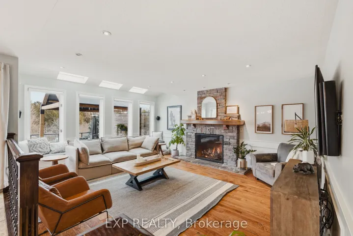 +"PublicRemarks": "Welcome to life in West Montrose, where privacy, space, and a more considered pace of living come together just minutes from the city. Set on over half an acre in the heart of Old Order Mennonite countryside, this beautifully updated home offers a rare balance of peaceful surroundings and everyday convenience, with easy access to Waterloo, Elmira, Elora, and Guelph.A timeless stone exterior, mature trees, and an extended driveway create a strong sense of arrival. Inside, a grand two storey foyer with a curved staircase introduces the home with scale and quiet sophistication. The main floor moves easily between everyday living and entertaining, with a bright front den, formal dining room, and an open kitchen and living space filled with natural light. The kitchen is both refined and highly functional, centred around a generous island with seating, extensive cabinetry, a coffee station, and an oversized gas range, positioned just off the garage and mudroom entry.Skylights and a wall of windows define the sunken living room, where a gas fireplace and built in reading bench create a warm focal point. Upstairs, four bedrooms offer well proportioned space with hardwood flooring throughout. The primary suite is set apart, featuring an ensuite with heated floors, a soaker tub, glass shower, and a connected dressing room or office with skylights leading to a walk in closet.The finished lower level adds versatility with a wine cellar, a fifth bedroom with cabinetry, sink, and built in appliances, ideal for guests or extended living, along with a spacious recreation area and full bathroom.Outdoors, the property is designed for both entertaining and retreat, featuring a 44x22 saltwater pool, expansive deck, pergola, landscape lighting, an irrigation system for the lawn and gardens, and an invisible fence system.A rare opportunity to experience refined living in one of the region's most sought after settings."