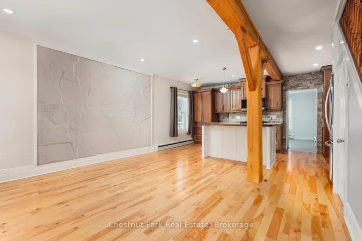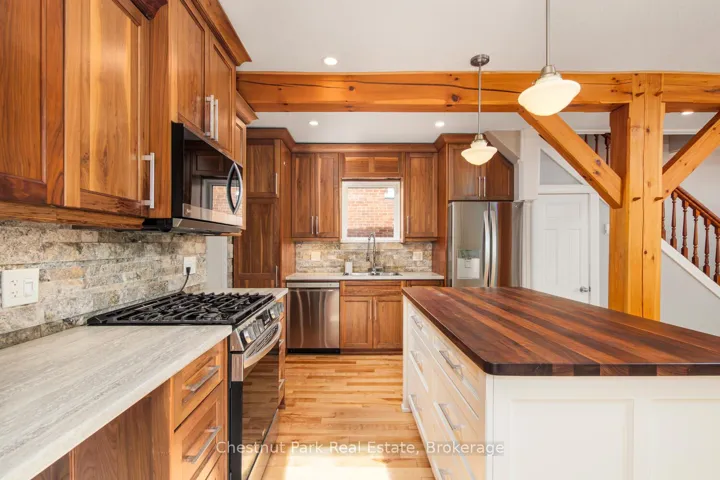 +"PublicRemarks": "Welcome to this beautifully maintained 1.5-storey, ideally situated home in a highly sought-after family neighbourhood in Owen Sound. This move-in ready property offers a perfect balance of style, comfort and functionality. Inside, you'll find warm hardwood flooring throughout much of the home, a bright and updated walnut kitchen with a large centre island; designed for everyday living. The open concept living room with custom wood beams, is bathed in natural sunlight. There is also a spacious main floor den/office/bedroom, ideal for relaxing and entertaining, with access to the side deck. Main floor laundry adds practicality to the thoughtful layout. A new hi efficiency gas boiler/on-demand hot water (Dec 2025) ensures efficient, reliable heating. The lower level provides plenty of storage space, a workshop area and a convenient walk-up to the rear yard. Too many updates to list; front door (2025), custom front porch with high end railings & posts (2023-2024), eavestrough (2024), paved driveway (2022), asphalt shingle roof (2021), and upgraded electrical (2017); all provides peace of mind for years to come. Ask to see the entire list of updates! Step outside to enjoy a covered timber frame front porch, perfect for morning coffee, or head to the south-facing deck; an inviting space for summer barbecues and outdoor gatherings. This home's layout and immaculate condition make it an excellent choice for 1st-time buyers, right sizers, or anyone seeking a low-maintenance lifestyle. Located just minutes from Kelso Beach Park with its popular splash pad, the marina and premier golf destinations, offering abundant recreational opportunities. Enjoy proximity to the sparkling waters of Georgian Bay, renowned for boating, fishing and scenic shoreline views. Excellent schools, parks and everyday amenities are all close by, making this a truly desirable place to call home. A wonderful opportunity to enjoy comfortable, move-in ready living at this special landscaped property."