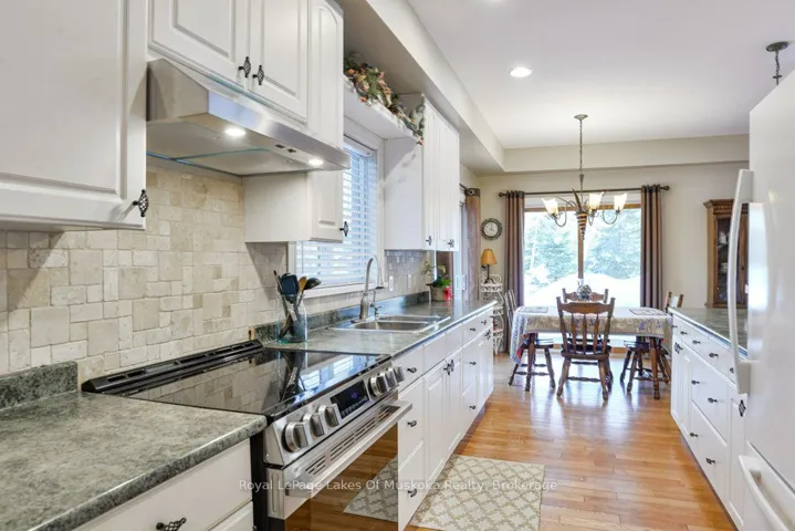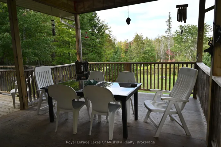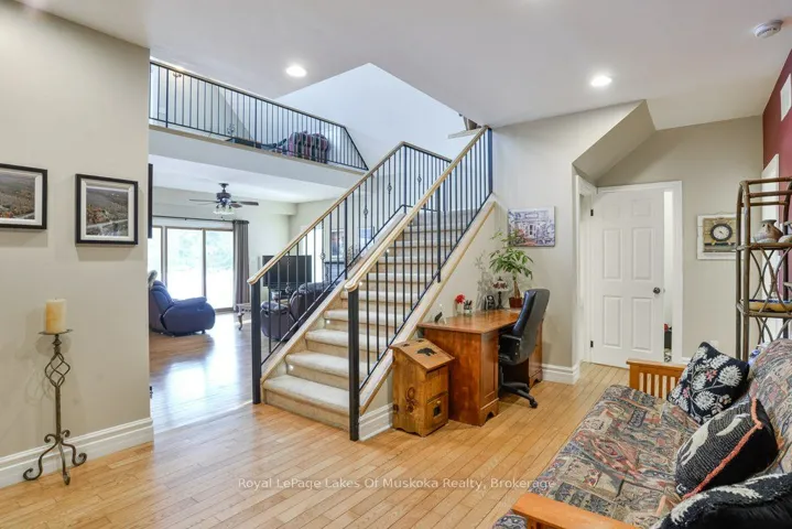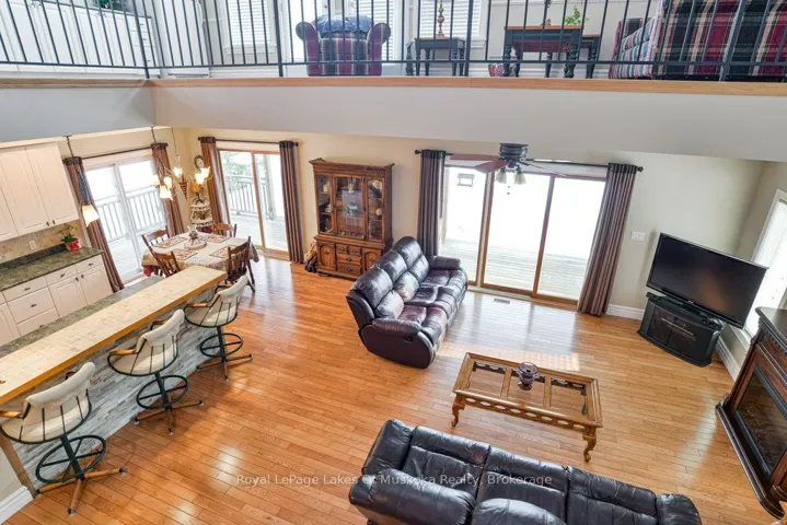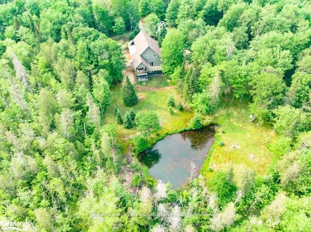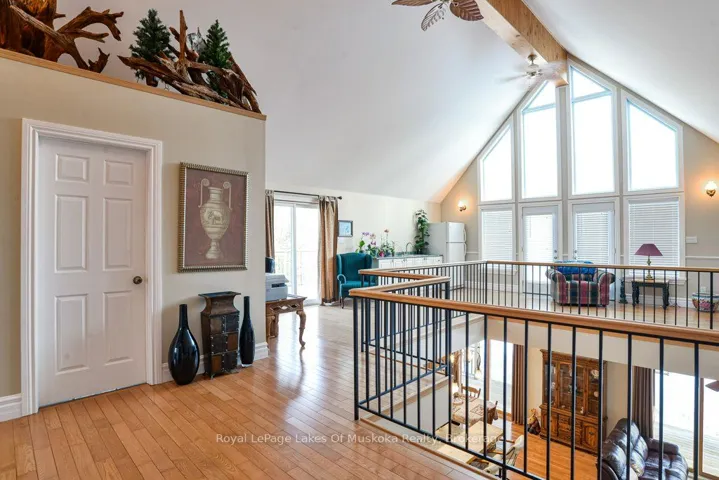 +"PublicRemarks": "Welcome to your private country sanctuary nestled on a picturesque 2-acre lot overlooking a tranquil pond where birds and wildlife gather. This thoughtfully designed custom-built home with 3800sq. feet of living space offers the perfect blend of space, comfort, and Muskoka charm - ideal for extended family living or hosting overnight guests. Enjoy warm summer breezes from the expansive wrap-around veranda that flows seamlessly into a large, covered deck - perfect for outdoor dining and BBQs while taking in peaceful views of the pond and surrounding forest. Inside, the open-concept main floor welcomes you with soaring cathedral ceilings and gleaming red ash hardwood floors. The spacious primary bedroom is conveniently located on the main level, complete with patio doors leading to the backyard deck and pond views. A generous 4-piece bathroom and main floor laundry add to the home's functionality. Upstairs, a versatile loft with a wet bar opens through patio doors onto two large private balconies offering stunning forest views. Two additional bedrooms and another full 4-piece bathroom complete the upper level. The lower level presents incredible potential for approximately 1,400 sq. ft. of additional family accommodations. With above-grade windows and two walkouts to the backyard, the space is bright and welcoming. It currently includes a finished fourth bedroom, a third 4-piece bathroom, a spacious rec room, and a family room that could easily be completed as an eat-in kitchen. (Kitchen cabinets are included in the sale but not installed.) Adding even more charm is the adorable bunkie beside the home - perfect as a studio, workshop, or extra guest accommodations. Located just a short drive to town and only five minutes from the public beach on Prosect Lake, you can enjoy a refreshing swim or launch your watercraft for a day of fishing. This is Muskoka living at its finest - where you can work, live, and play surrounded by nature, privacy, and timeless country beauty."
