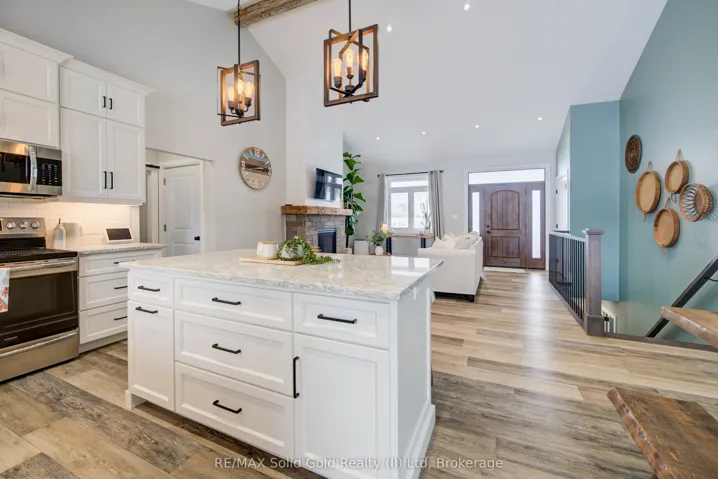 +"PublicRemarks": "1/2 ACRE LOT!!! Welcome to this stunning 5-year-old custom-built home perfectly situated on an expansive half-acre lot in the small, quiet town of Holyrood just minutes from Kincardine and its beautiful sandy beach. Located with a quick commute to Bruce Power the areas main employer, this property offers the ideal balance of peaceful living and everyday convenience. The home's exterior impresses with "WOW".... with timber accents, stone detailing, and thoughtfully placed exterior lighting, creating exceptional inviting curb appeal. An oversized two-car garage provides ample space for vehicles, storage, and hobbies not to mention the 6 exterior parking spaces for toy storage like RV's, sleds or Boat storage!. Inside this custom beauty, no expense has been spared. Soaring cathedral ceilings, quartz countertops, a stone fireplace and carpet free throughout the home this bright open-concept layout set the stage for modern living. The well-designed modern kitchen with stainless appliances, seamlessly flows into the main living space, and is a dream for both cooking and entertaining, The spacious primary bedroom retreat features a large walk-in closet and a massive, light-filled ensuite, complete with a walkout to the covered back deck. Finally, find on this level a further two bedrooms that are both bright and roomy and placed away from the primary suite adding to additional privacy for all. The fully finished lower level offers incredible versatility, featuring an additional bedroom (ideal for guests, a home office, or gym) and an expansive family/entertaining spaces ready to enjoy. Outside, the huge lot with no direct rear neighbours offers privacy and endless potential for future development-whether you envision gardens, play areas, or outdoor entertaining spaces or perhaps that shed to house all your summer/winter toys!. This exceptional property combines quality craftsmanship, thoughtful design, and an unbeatable location-an opportunity not to be missed."