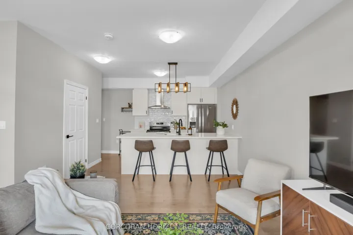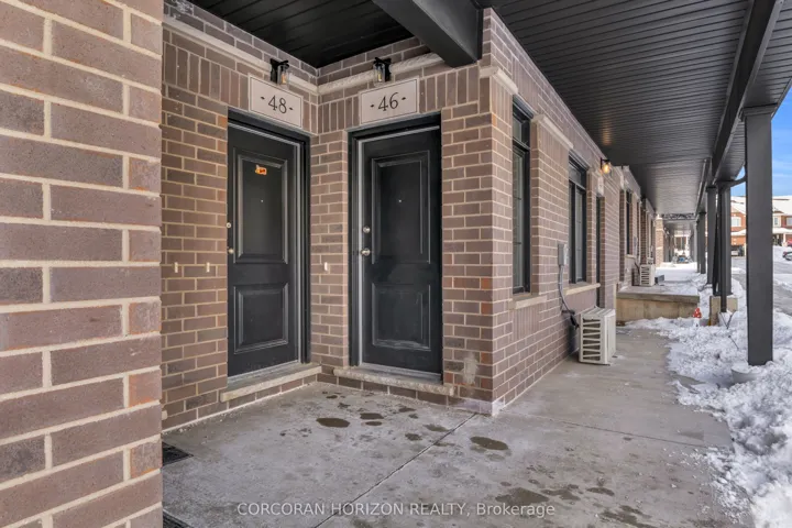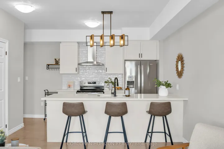 +"PublicRemarks": "Welcome to 46 Oat Lane, a beautifully maintained two storey stacked townhouse in Kitchener's sought after Huron Park community. This 2 bedroom, 2.5 bathroom home has been thoughtfully cared for and shows in pristine condition, offering a warm and inviting space you will feel proud to call your own. The main living level features 9 ft ceilings, hardwood flooring, and large windows that fill the open concept layout with natural light. The kitchen, dining and living areas flow seamlessly together, creating a comfortable setting for both quiet evenings at home and time spent with family and friends. The kitchen is finished with upgraded stainless steel appliances, quartz countertops, and a peninsula with a built in sink and bar seating, making it as functional as it is welcoming. Sliding glass doors off the dining area lead to a private balcony, perfect for relaxing outdoors. A convenient powder room completes this level. Upstairs, two well sized bedrooms provide privacy and comfort. The primary bedroom includes a walk in closet, an upgraded ensuite, and its own private balcony, an ideal spot to start your day with a morning coffee. A four piece bathroom serves the second bedroom, and upper level laundry adds everyday ease. Surrounded by parks, trails, schools, shopping and cafes, this home offers low maintenance living in a friendly, well established neighbourhood that continues to grow in popularity."