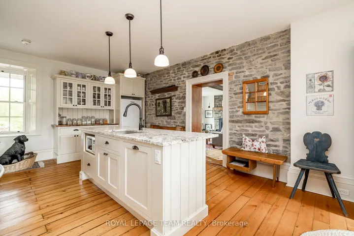 +"PublicRemarks": "Welcome to Spillway Farm, circa 1835, a stunning waterfront stone home w/ exquisite custom renovations by Hubbard & Co! Located along the Rideau System, UNESCO World Heritage site, this breathtaking waterfront home offers a rare blend of preservation of historic allure w/contemporary convenience & design. Featuring 4 bedrooms + den, 3 full bathrooms & many elegant rooms for entertaining, this home is filled with natural light accentuating its inherent warmth & rich heritage. The custom kitchen w/waterfront view & exposed stone wall showcases luxury cabinetry, granite countertops, an island w/seating, refurbished wood floors & a pantry w/artistic coffee bar! The kitchen leads seamlessly to the elegant dining room w/deep window sills, wide baseboards & refurbished flooring, or to the majestic living room w/stone fireplace, wood hewn mantle & exceptional waterfront views! A side entrance w/inside entry to a garage w/additional loft storage space is conveniently adjacent a full bath/laundry room w/exposed stone wall, farmhouse drop sink & ample cupboard/counter space for laundry area. An office/den off the rear entry deck offers water views, deep window sills & refurbished original floors. The spacious second level showcases 4 bedrooms, one presently utilized as an office, a main bath w/sliding wood door, ample closet & storage space, deep window sills & refurbished floors. The primary bedroom leads to a gorgeous 4-piece ensuite bathroom w/penny round flooring, tiled shower, & a claw tub w/waterfront view! Landscaped w/stunning perennials, rose bushes, numerous tree varieties & a flag stone entry w/full concrete driveway. Rear tiered deck & porch offer many spaces for entertaining; aesthetic stairs lead to expansive dock for unparalleled sunset views! Spillway Farm is a paradise where you can watch loons, osprey, blue herons or traverse the spectacular Rideau waterway via boat from your Fendock; this tranquil waterfront oasis in a historic community awaits!"