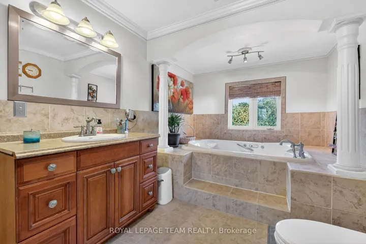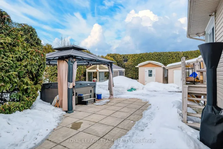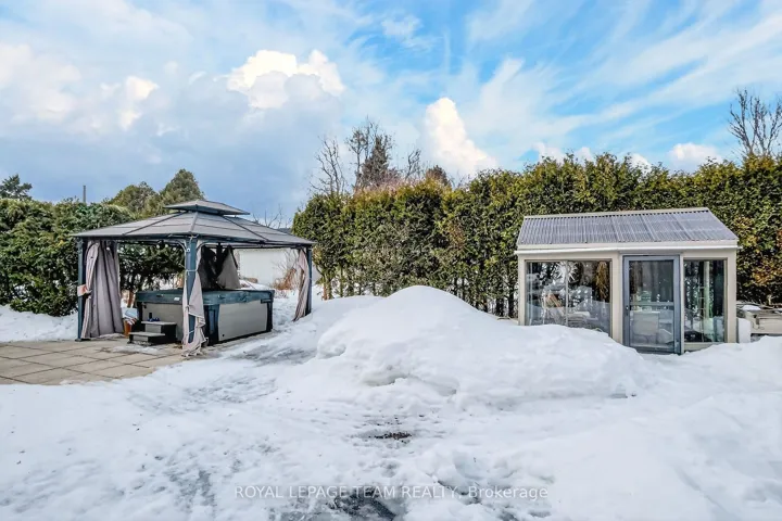 +"PublicRemarks": "Stop the Car! Nestled in a peaceful country setting, this charming raised bungalow offers space, comfort and exceptional outdoor amenities. Welcoming front porch opens to a generous foyer. A beautiful eat-in kitchen featuring abundant cabinetry and spacious dining area along with a breakfast bar. Large living room is warm and inviting with a cozy brick fireplace (insert) note the crown mouldings. Hardwood and tile throughout the main level. Main level offers 2 bedrooms, convenient powder room and a stunning spa-like bath with jetted tub & separate shower. The lower level provides excellent additional living space with good sized windows for natural light, rec room with another fireplace (insert), 3 more bedrooms and a 3pc bath/laundry combo. There is a second entrance/foyer at the back of the home. Total of 4 points of entry. The property features a detached 2 car garage an insulated/heated workshop, another shed attached to garage, a garden solarium and a patio with a gazebo / hot tub (2022) Central Air was installed in 2021. Enjoy the privacy with lots of mature hedges, as well as the very thorough security system. Parking for at least 8 cars."