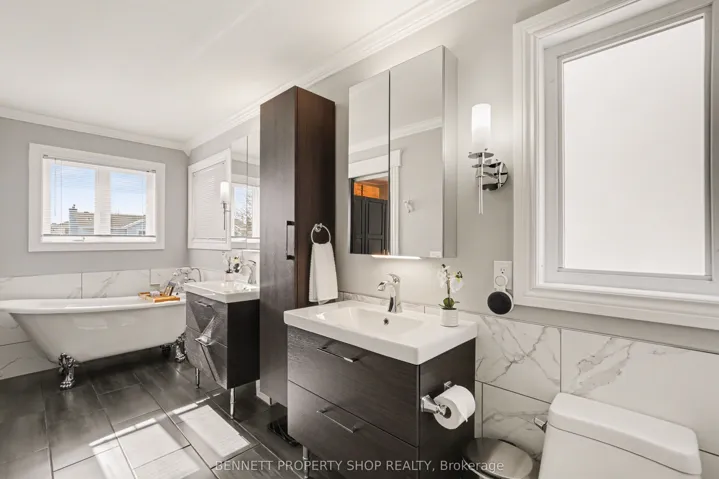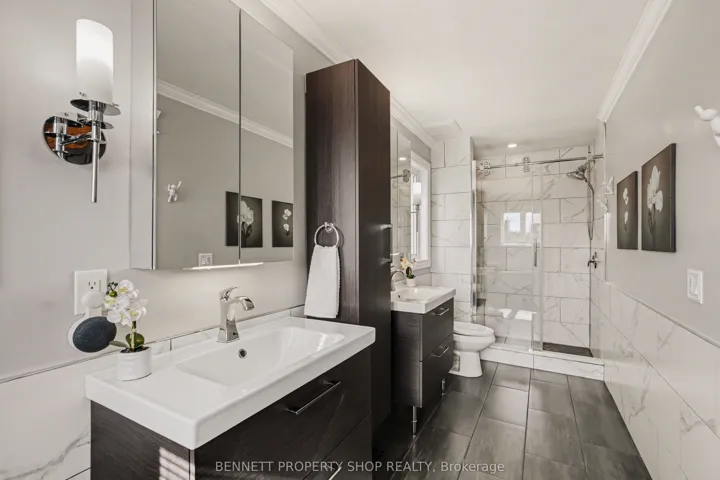 +"PublicRemarks": "Nearly new and completely custom, this oversized bungalow offers a fantastic floorplan of 2,050 sq.ft. on the main floor with another 1,800 sq.ft. downstairs. Tucked away in the north-east corner of Niagara Falls, homes like this are an exceedingly rare find. Arrive home and pull into the exposed aggregate concrete double driveway. The double garage has a door into a main floor mud room. When you enter the front foyer, you'll find a warm and welcoming entrance hall with engineered oak hardwood running through most of this level. The main floor is comprised of three bedrooms including a full primary suite complete with walk-in closet and gorgeous ensuite bathroom with heated tile floors, 5' tiled walk-in shower, stand-alone soaker tub & double vanity. Ceiling heights range from 10' all the way up to 12' in the coffered ceiling in the living room. The kitchen is an absolute stunner with all of the extras you would expect including Cambria quartz counters, custom cabinetry with dovetail joinery, ample pot drawers, and beautiful finishing details. The living room is centered around the gas fireplace with floor-to-ceiling stone surround and reclaimed wood mantel. The lower level is the place to be! With a second kitchen area with stone counter, bar, huge recroom and gas fireplace, you may find your friend circle expands when the big game is on! With luxury vinyl plank throughout, you'll also find another bedroom, playroom, and library, along with another bathroom with a tiled walk-in shower. Head outside to the covered patio adjacent to the heated saltwater pool. The pool has all the bells and whistles including an automatic safety cover, LED lit Laminar jets, bubbler in the bench in the shallow end, Pentair digital control from your phone, heater, and slide! Oh, and there's a hot tub too! So, you may find your friend circle expands yet again during the summer months. Be sure to check out the video tour. This is an absolute 10 out of 10!"