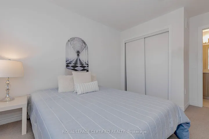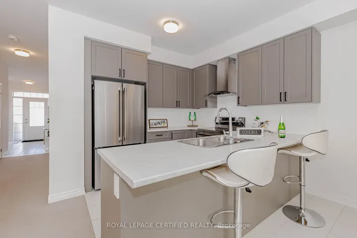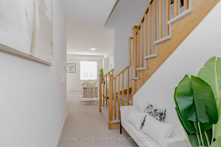 +"PublicRemarks": "Welcome to this stunning three-bedroom, 2.5-bathroom two-storey townhouse built by Sorbara, offering a bright, functional layout and beautiful natural surroundings. Backing onto a peaceful pond, this home provides both privacy and scenic views while being filled with an abundance of natural light throughout.The spacious primary bedroom serves as a comfortable retreat, complete with a walk-in closet and a private three-piece ensuite. Large windows brighten every room, and upgraded Berber carpeting adds warmth and comfort throughout the home.The main floor features impressive 9-foot ceilings and a well-designed open-concept living and dining area-perfect for entertaining or relaxing with family. The modern kitchen is equipped with energy-efficient stainless steel appliances, a stylish subway tile backsplash, and a breakfast bar overlooking the backyard and tranquil pond views.Additional highlights include a convenient main-floor powder room, water softener, garage door opener, and direct access to the garage from inside the home for everyday convenience. The unfinished basement provides plenty of storage space and offers great potential for future customization.With its bright interior, peaceful pond setting, and thoughtful upgrades, this home offers the perfect balance of comfort, style, and location."