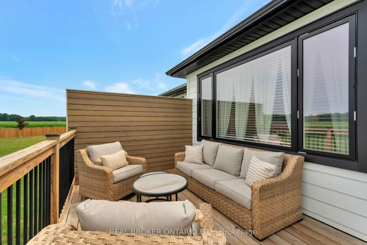 +"PublicRemarks": "This stunning 2,141 sq. ft. bungalow is set on a picturesque lot and offers exceptional curb appeal with a double-car garage, elegant stone accents, metal roof, and sleek black trim. Beautiful landscaping and a wide concrete walkway welcome you into a thoughtfully designed home featuring soaring 9-foot ceilings and upscale finishes throughout. The gourmet kitchen is a showstopper, complete with rich dark cabinetry extending to the ceiling, striking high-contrast quartz countertops, upgraded fixtures, and tiled floors and backsplash. The oversized island is ideal for casual dining and entertaining, while the adjoining dinette offers a more formal dining space with walk-out access to the raised deck-perfect for indoor/outdoor living and enjoying scenic views. The living room invites you to unwind by the cozy stone corner gas fireplace. Additional main-floor conveniences include a stylish 2-piece powder room and a separate laundry room with custom cabinetry and quartz counters. The primary bedroom serves as a private retreat, featuring a luxurious 4-piece ensuite with a stunning glass shower and a relaxing soaker tub. Two additional bedrooms offer generous space for family, guests, or a home office, and are supported by a full 4-piece bathroom. The expansive double-car garage provides ample room for vehicles and storage, while the single-wide driveway expands to a triple-wide apron, offering abundant parking. The unfinished basement includes a finished staircase, bathroom rough-in, and deep windows-an excellent opportunity to create additional living space tailored to your needs. Ideally located close to schools, shopping, and everyday amenities, this exceptional home is also just 30 minutes from Amazon, Toyota, and Volkswagen's Battery Plant-making it a perfect blend of modern style, functionality, and convenient commuting."
