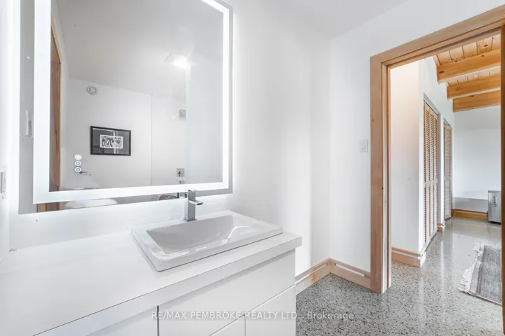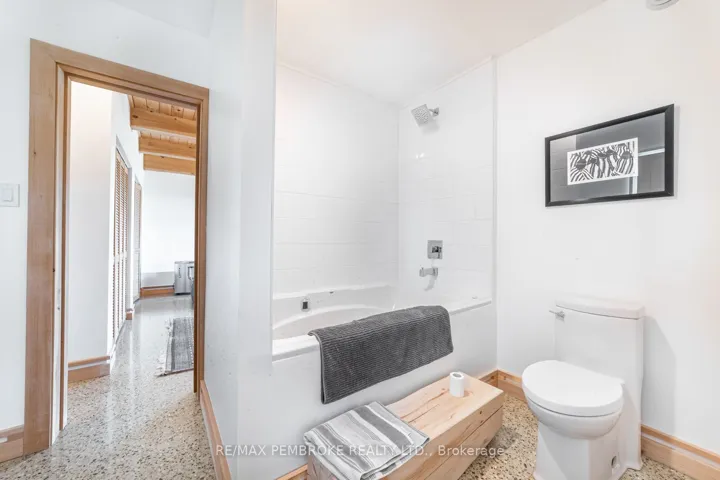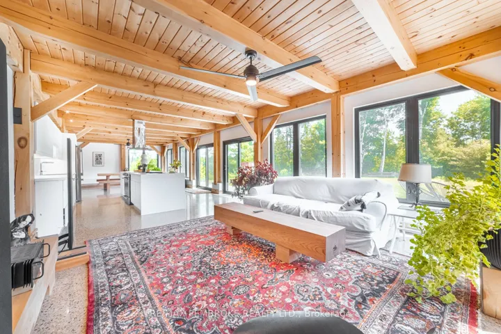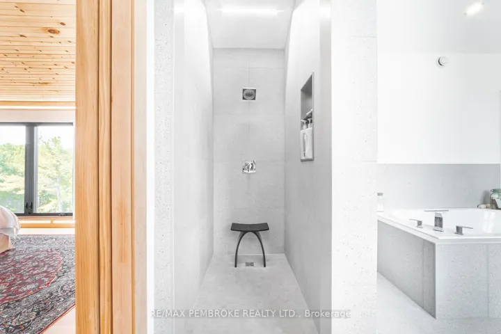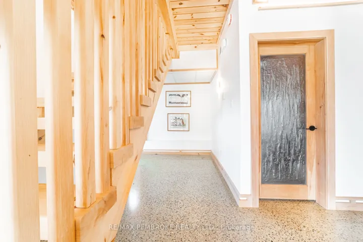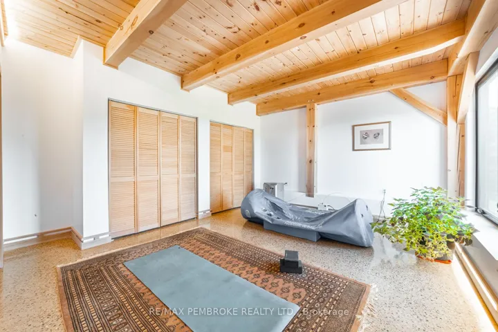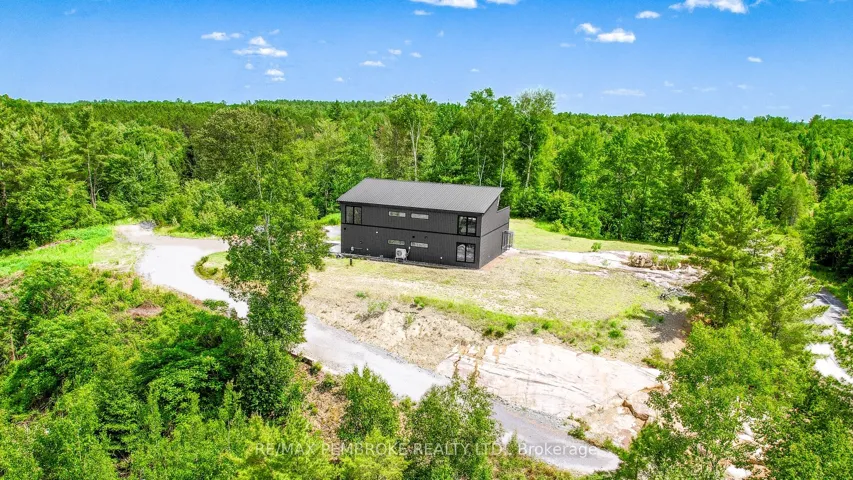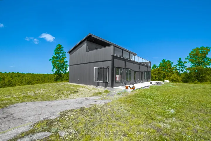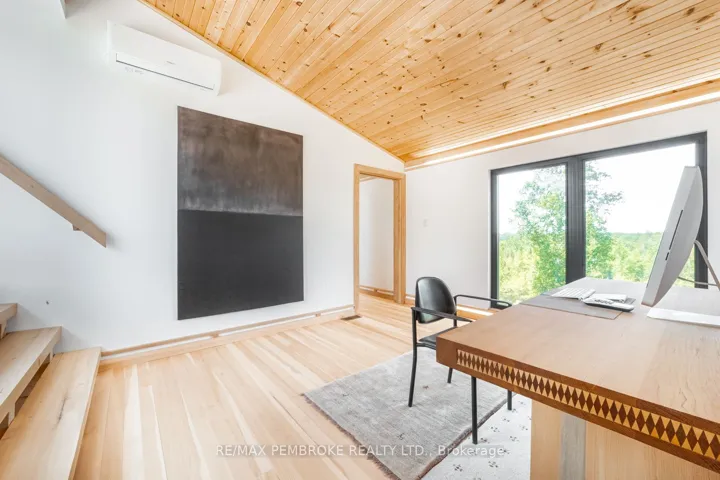 +"PublicRemarks": "This Scandinavian style chalet is perched atop the rugged Canadian Shield offering sweeping views of the tree tops and glimpses of the Petawawa River. Walk in the door and be awed by the natural light flooding in, seamlessly blending the outside with the inside. Masterful craftsmanship of the post and beam construction done by John R. Mac Donald from Algonquin Timberframe. Polished concrete floors, in-floor heating, amazing pine staircase and floor to ceiling windows all give the feeling of being in a spa! The kitchen offers a 12' island with seamless white cabinetry, soft closures and stainless steel appliances. There are 2 primary suites offering attached spa like baths (1 on the main floor and 1 on the 2nd floor). Mud room area with loads of closet space and a main floor laundry. Make your way to the 2nd floor where you will find 2 good sized bedrooms with unique access to the large deck. The 2nd floor deck is private and a relaxing area great for yoga or entertaining and even has its own outdoor shower. The deck has a glass balustrade and waterproof Goodyear membrane. The bedrooms each have energy-efficient heat pumps with AC. This style and location of home is perfect for the outdoor enthusiast and offers easy access to Highway 17 for commuting to CNL, Garrison Petawawa or into Pembroke."