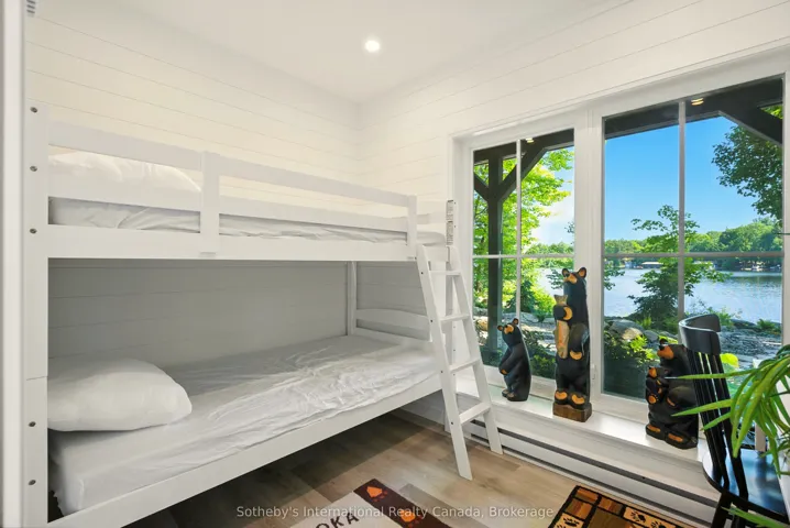 +"PublicRemarks": "Thoughtfully redesigned for effortless four-season living, this exceptional Muskoka retreat blends classic cottage character with modern comfort. Rebuilt from the exterior walls in and lifted to create a full-height walkout lower level, the cottage retains its rare grandfathered proximity to the shoreline - a privilege no longer permitted under current bylaws - allowing for uninterrupted lake views and a natural connection to the water.The main level is bright and inviting, with vaulted ceilings, warm wood accents, and a custom kitchen anchoring the open-concept living and dining areas. A propane fireplace adds warmth while expansive windows frame the lake beyond. The former Muskoka Room has been beautifully reimagined with new windows and a sliding door to the BBQ deck, now integrated with the principal living space as a relaxed den or family room that feels connected yet distinct. Glass doors open to a spacious deck with sleek glass railings and southwest exposure, offering ideal spaces to gather, dine, and enjoy long summer afternoons by the water.The main level also includes a private primary suite with ensuite bath, along with a powder room and laundry.The walkout lower level provides three guest bedrooms, each with its own bath, and a bright family area with lake views. Outdoors, the professionally landscaped lot features 150 feet of pristine frontage, a sandy shoreline, and deep water at the dock. A single-slip boathouse enhances the waterfront experience. A beautifully finished coach house above the heated garage offers two bedrooms, a full bath, and an open-concept living space with kitchenette, laundry, and heat pump for year-round comfort.Two new septic systems, a Generac generator, and easy access to Bala and Port Carling by road or boat complete the offering. A substantial furniture package is included, allowing for immediate enjoyment."