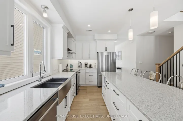 +"PublicRemarks": "Custom-designed 2,351 sq/ft home featuring 4+1 bedrooms and 3.5 baths in sought-after Riverview, nestled on a quiet street with a premium walkout basement. This stunning home is loaded with upgrades, including hardwood floors, ceramic tile, and 9-ft ceilings throughout the main level. The spacious kitchen boasts quartz countertops, a centre island with extended breakfast bar, pot lighting, under-cabinet lighting, pots & pans drawers, stainless steel canopy range hood, built-in pantry, and included stainless steel appliances. The living and dining areas impress with a dramatic vaulted ceiling, pot lighting, large bright windows, and a cozy gas fireplace, plus sliding doors leading to a large rear deck with glass railings and natural gas BBQ included. A main floor office provides a convenient workspace, while a generous mudroom offers access to the double car garage. Upstairs, you'll find four spacious bedrooms, including a primary suite with walk-in closet and ensuite featuring tile floors and a beautiful 5-ft tiled shower w/sliding glass doors. The partially finished basement includes a large bedroom, rec room with Dricore subfloor and carpet, and walkout patio doors to the backyard and expansive patio. A 4-piece bathroom with tile floors completes the lower level. Additional features include central air, HRV, on-demand hot water, and more. Ideally located steps to Riverview Shopping Centre and just minutes to downtown Kingston, CFB, and the 401."