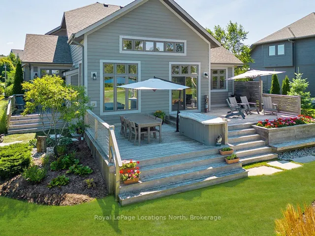 +"PublicRemarks": "Stunning Lora Bay property, offering breathtaking views of Georgian Bay.5 minu to Downtown Thornbury and a short drive to private golf clubs.Inside, the main floor boasts an open concept design with cathedral ceilings in the great room and large windows offering a view of the bay. The chefs kitchen features high end appliances, including a bar fridge and a peninsula with seating, ideal for entertaining. Also on the main floor you'll find a large primary suite, office/den, powder room, dining space and access to the garage from the laundry room. The primary suite boasts a walk out to a private deck, spacious walk in closet and spa-like 5pc ensuite bath.Upstairs features 2 guest bedrooms, 4pc bathroom and a relaxing bonus space, the perfect cozy nook to read your favourite book.The lower level is partially finished with a bedroom and 4pc bathroom. A large unfinished space has the potential for a generous sized rec room!The exterior was designed by Fran Moore, the 2023 Designer of the Year for MOD Design. The landscape features are a testament to both beauty and functionality with an irrigation system and a tranquil water feature just off the cedar deck. The outdoor amenities include a cedar deck equipped with a gas line directly connected to the BBQ, perfect for outdoor entertaining. An attached garage with a double kayak rack provides storage for outdoor enthusiasts. For added convenience the built-in LUTRON system controls the front porch lights remotely via smartphone. The exterior has recently been painted (Aug 2025).Other great features of this home include wifi enabled LENNOX i-comfort thermostat which can be monitored and controlled from anywhere via phone.Located just minutes from Downtown Thornbury, Lora Bay offers a host of amenities, including a golf course, a delightful restaurant, a members-only lodge, a gym, and two beautiful beaches. Embrace the sense of community in this welcoming enclave, where every day feels like a retreat.Monthly fee approx $105."