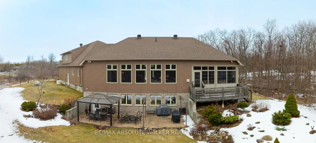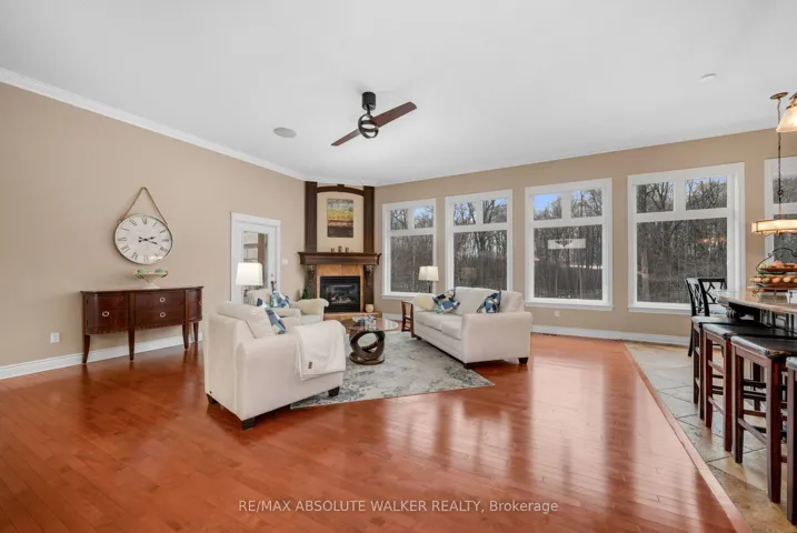 +"PublicRemarks": "Set on a private, wooded 1.97-acre executive lot just 20 minutes from downtown Ottawa, this custom Corvinelli bungalow features over 4,800 sq.ft. of thoughtfully designed finished living space with 3+2 bedrooms and 3 full bathrooms. An extra-wide foyer welcomes you into beautifully appointed principal rooms. The living room impresses with 11ft ceilings, architectural mouldings, a warm fireplace, and expansive windows showcasing forest views. A wet bar with a beverage fridge and wine storage adds the perfect touch for entertaining while the formal dining room, framed by decorative columns, features a custom coved ceiling and provides an elegant setting for gatherings. At the heart of the home is a chef-inspired kitchen with granite countertops, a large centre island with seating, heated floors, Jenn Air double wall ovens, a gas cooktop, and custom maple cabinetry. A spacious walk-in pantry offers excellent storage. Just beyond, the three-season sunroom with a fireplace overlooks the landscaped gardens and deck, creating a warm and inviting retreat. The private primary suite offers rich hardwood flooring, large windows, a walk-in closet, and a spa-like ensuite with heated floors, a double vanity, and an oversized walk-in shower with dual shower heads. An additional main floor bedroom, a full bathroom, and a well-designed laundry room with custom cabinetry complete this level. A bonus room above the garage offers the perfect space for teenage retreat, guest room, or studio. The walk-out lower level is ideal for guests or multigenerational living with a bright family room, accessory kitchen, two bedrooms, a full bathroom with heated floors, plus flexible spaces including a home theatre/gym, office, and workshop. Additional highlights include a three-car garage with 9ft doors and EV charger connection, a 17k W Generac generator, and upgraded insulated siding (2024). An exceptional property offering luxury, space, craftsmanship and privacy."