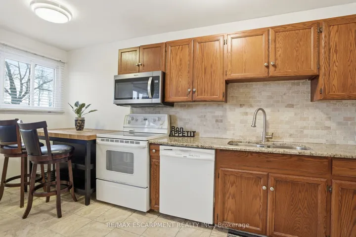 +"PublicRemarks": "Welcome to this charming end-unit townhome located in the sought-after West Mountain community. Nestled in the quiet and well-maintained Garthstone Estates complex, this home offers approximately 1,300 sq ft of finished living space with 3 bedrooms and 2 bathrooms - an excellent opportunity for first-time buyers or those looking to downsize. Ready for immediate occupancy, the home features a bright, open layout with several tasteful updates. The eat-in kitchen and bathroom showcase granite countertops, while newer windows and updated ceramic and laminate flooring add a modern touch throughout. The spacious living room is perfect for relaxing or entertaining and is highlighted by a beautiful gas fireplace. With east and west exposure, the home enjoys plenty of natural light throughout the day. Step outside to your private, fully fenced backyard surrounded by mature trees, complete with a large patio ideal for outdoor dining and gatherings. The yard is conveniently accessed through the kitchen. Additional features include two parking spaces - one in the attached garage and another in the private driveway right outside the front entrance. The basement offers extra living space and future potential. Located just steps from public transit with easy access to the #35 HSR bus to Mohawk College, this home is also ideal for commuters with quick connections to the Lincoln Alexander Parkway, Red Hill Valley Parkway, QEW and Highway 403. Close to schools, parks, shopping, and everyday amenities, this well-managed complex also includes basic cable in the condo fees."