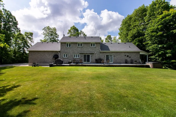 +"PublicRemarks": "Gracefully set upon a serene country lot, this custom-built residence embodies timeless elegance and refined living. Surrounded by mature trees and natural beauty, the property offers a rare sense of privacy and tranquility-an exceptional retreat from the everyday. Inside, soaring ceilings in the main living room create a sense of grandeur, while a thoughtfully designed layout ensures both comfort and effortless flow. The kitchen, complete with built-in appliances, is both sophisticated and functional-perfectly suited for intimate gatherings or elevated entertaining. The home offers three generously sized bedrooms with the primary on the main level with four beautifully appointed bathrooms, providing ample space for family and guests alike. The fully finished basement extends the living space with a stylish bar area, creating the perfect setting for hosting, while offering an abundance of storage to keep everything organized and out of sight. Outdoors, a wrap-around Trex deck invites you to relax and take in the peaceful surroundings. Unwind in the hot tub, entertain under the open sky, or envision the possibilities there is plenty of space to add a pool and create your own private outdoor oasis. The manicured grounds are effortlessly maintained with an automatic sprinkler system, keeping the landscape lush throughout the seasons. Adding further appeal, this property features a shop ideal for hobbies or a home-based business, an expansive two bay garage, with a large parking area with room for multiple vehicles, trailers, or guests. This remarkable property is a seamless blend of craftsmanship, elegance, and country charm offering a lifestyle defined by space, privacy, and quiet sophistication."