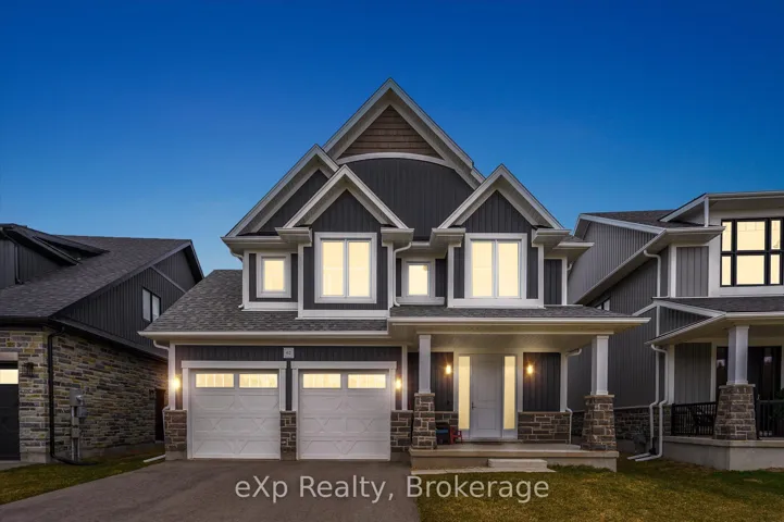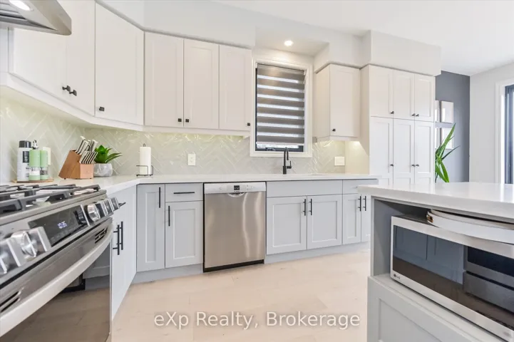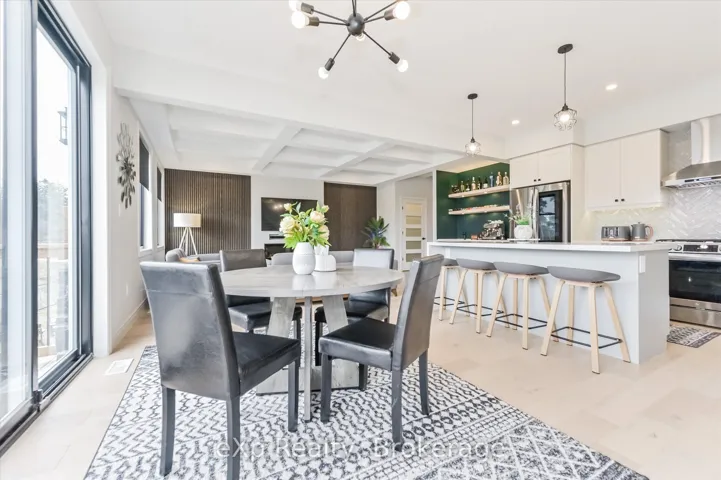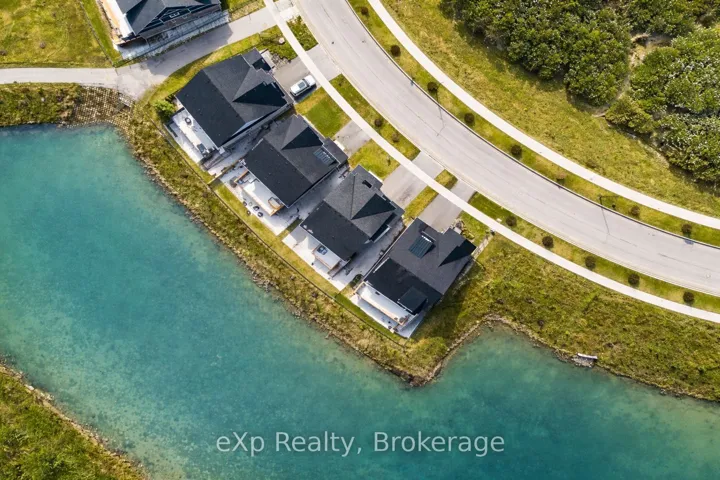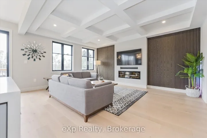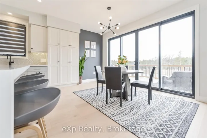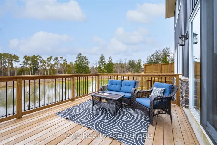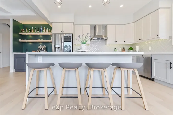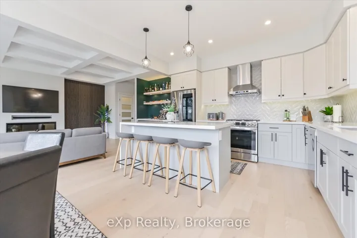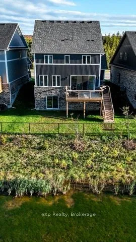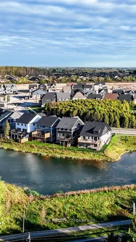 +"PublicRemarks": "Overlooking a tranquil pond in Elora's highly sought-after South River community, this 2023 Granite Home build offers a seamless blend of modern design and relaxed, nature-inspired living. With 4 bedrooms, 3 full bathrooms and a powder room, this home is thoughtfully laid out for both everyday comfort and stylish entertaining, just a short walk to downtown Elora and nearby trails including the Trestle Bridge Trail.Inside, every detail has been carefully considered. The kitchen stands out with a herringbone backsplash, two-tone cabinetry featuring cream uppers and light grey lowers and island, waterfall quartz countertops, sleek black hardware, a gas stove, and a custom coffee bar. The family room is warm and inviting, highlighted by a gas fireplace, walnut slat feature walls, and coffered ceilings that add depth and character. A striking glass staircase leads to the upper level, where a spa-like bathroom features a waterfall shower with niche and glass surround. White oak flooring and black window frames carry a clean, modern feel throughout.The finished walkout basement is bright and functional, offering additional living space with direct access to the backyard and peaceful water views. Complete with a double car garage and refined finishes throughout, this home presents a beautifully finished opportunity in one of Elora's most desirable neighbourhoods. Quick closing available."