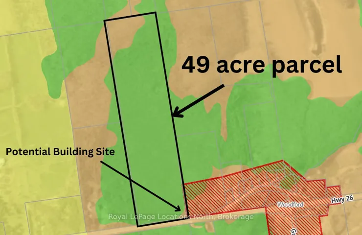 +"PublicRemarks": "49 ACRE WOODLAND located just outside Meaford. There is a potential building site located in the front right (south/east) corner of the property where the driveway is located. The lot could potential be logged. Approximately 40 acres of softwood (south end) and 10 acres of hardwood (north end). A four wheeler trail leads you to the back of the property with higher elevation. Ideal for outdoor enthusiasts, the property is well-suited for hunting, maple syrup production, recreation and more. It's located directly across the road from the Bruce Trail, perfect for hikers and nature lovers. Governed by the Niagara Escarpment Commission, the current zoning allows for a wide range of agricultural uses and development, including a home and outbuildings. Hydro, natural gas, and other utilities are available at the lot line. Don't miss this unique opportunity to own a piece of natural paradise near Meaford!"