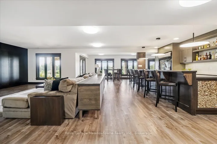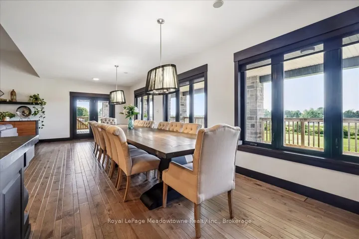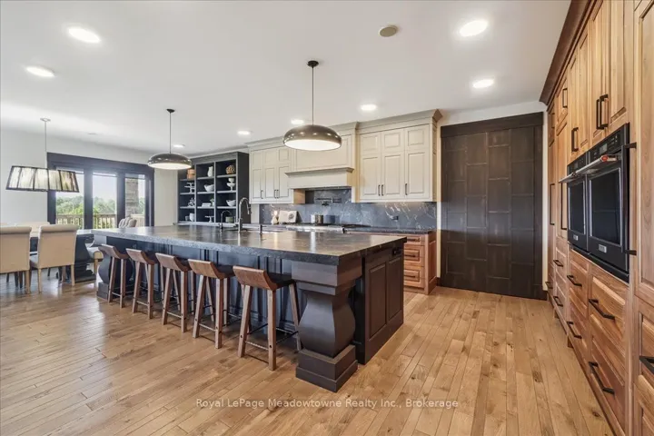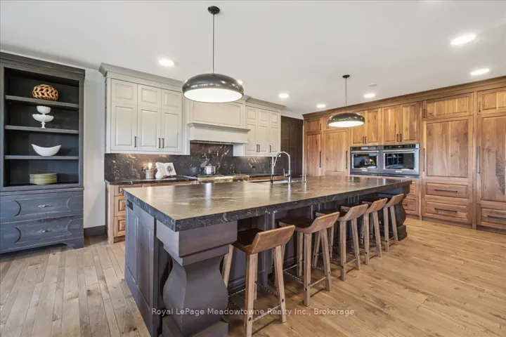 +"PublicRemarks": "This custom-built country bungalow, where craftsmanship meets comfort is an exceptional family home nestled in the rolling hills of Erin. Set on just under 9 acres of gently sloping lawns, a spring-fed pond, and endless outdoor beauty. From the moment you step inside, you'll feel the care and quality that went into this cabinetmakers personal residence. Striking details, soaring ceilings, and an open-concept layout set the stage, while over 200+ custom-built storage drawers keep family life beautifully organized. The heart of the home is a chefs dream kitchen, featuring solid wood cabinetry, high-end appliances, a massive quartz island with breakfast bar, and endless cupboard space. Gather in the great room around the fireplace, or share meals in the dining room as you soak in panoramic views of the countryside through the windows. Step outside to the elevated, covered balcony and catch unforgettable sunsets, your new favourite place to unwind. The main-floor primary suite is your own private retreat, with a coffered ceiling, spa-inspired ensuite, and a walk-in closet with built-ins that maximize both function and style. Two additional bedrooms offer the same high-quality finishes and thoughtful design. Head downstairs to discover the ultimate entertainment zone, a fully finished walk-out lower level with a large wet bar, cozy fireplace, theatre room, home office, and even a sauna. And then there's the workshop, an incredible 5,000 sq. ft. heated building with three 16x16 insulated doors, ideal for car enthusiasts, hobbyists, or entrepreneurs. Add in a 3-car garage, geo-thermal heating and cooling, in-floor heating throughout the basement and shop, fire pit & your family has found a forever home. This property doesn't just offer a place to live, it offers a lifestyle. From peaceful birdwatching by the pond to hosting unforgettable gatherings, this is country living reimagined for the modern family. This home is truly breathtaking & has to be seen to be appreciated."