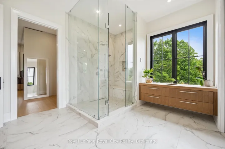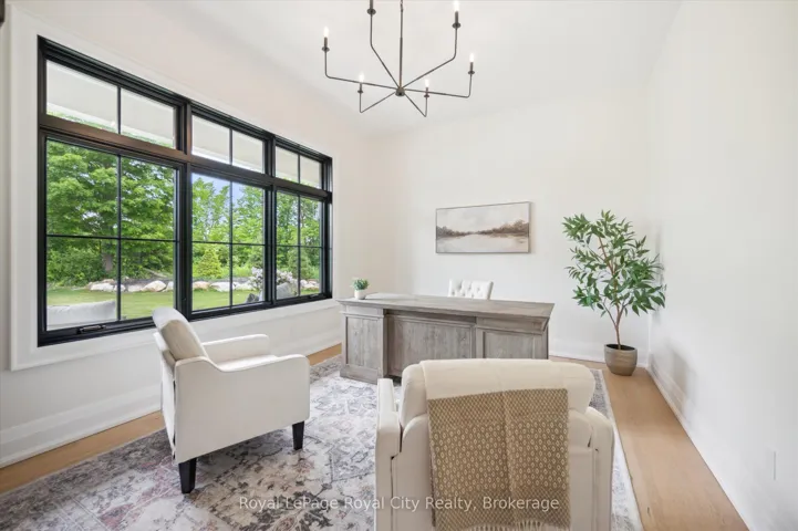+"PublicRemarks": "Custom-Built Luxury Bungalow on 2.4 Private Acres with Escarpment Views. Welcome to this one-of-a-kind custom-built bungalow offering 3,400 sq. ft. of refined main floor living space, perfectly nestled on 2.4 acres of serene countryside. With panoramic views of the escarpment and set well back from the road, this residence offers exceptional privacy while being just 20 minutes from the 401. Designed with luxury and functionality in mind, the home boasts soaring ceilings and oversized windows, creating an expansive, airy ambiance throughout allowing the natural landscape in and flooding the home with light. The main level features a seamless open-concept layout anchored by a great room and primary bedroom with oversized sliding doors opening to an extended outdoor living space with a two sided fire place, hot tub, and an abundance of entertaining space. The heart of the home is a chefs dream kitchen outfitted with top-tier Wolf, Sub Zero, and Cove appliances, complemented by a stylish servery just off the formal dining room. Retreat to the spacious primary suite, a true sanctuary offering an oversized spa-inspired ensuite complete with heated floors, a large walk-in shower, water closet, luxurious soaker tub, dual sinks with an extended vanity, and a generously sized walk-in closet. Two additional bedrooms on the main floor each enjoy their own private ensuites. Downstairs, the wow factor continues. The 10-foot ceilings and expansive windows make the finished basement feel anything but below grade. Designed for versatility, the lower level includes a full gym, sauna, and a private entry from the oversized 3-car garage making it perfect for an in-law suite. This separate living space features a bedroom, full bath, and kitchenette with a fridge, sink, and microwave. Every detail has been thoughtfully considered. Truly, this is a rare opportunity to own a stunning estate home where luxury, privacy, and convenience converge."