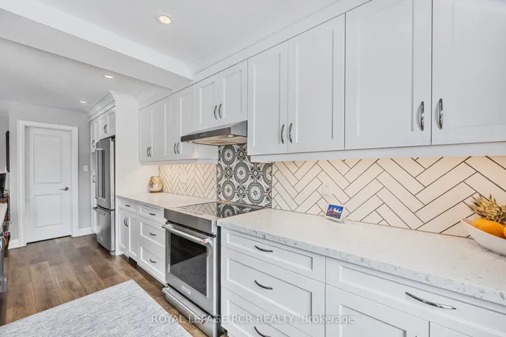 +"PublicRemarks": "Elegant 5-bedroom residence set on a generous 100' x 160' lot along a quiet, tree-lined street just south of Lakeshore. The thoughtfully designed main floor features formal living and dining areas, a private home office, and a convenient main-floor primary suite. The chef-inspired kitchen is equipped with premium appliances, a spacious island, and opens to a bright breakfast area framed by large windows and refined ceiling details.Upstairs offers four well-proportioned bedrooms, two full bathrooms, a second-floor laundry room, and a versatile bonus space ideal for a home office or playroom. The finished lower level provides additional living space, including a recreation room, fitness area, and wine storage.The landscaped backyard is perfect for entertaining, complete with a covered cabana for outdoor enjoyment."