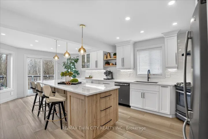 +"PublicRemarks": "Stunning, professionally renovated 3 bedroom, 4 bathroom home in a superior Idlewood location. Nestled on a premium court walk-out lot, backing onto Briarfield Park Natural Area. Meticulously maintained and loved by original owners. The interior has been beautifully transformed with recent extensive upgrades throughout, including exceptional kitchen by Polwood Kitchens with abundance of full height cabinetry, large island (11' long), quartz countertops, Stainless Steel appliances (gas stove/oven) and walk-in pantry. Bright with large windows and sliding doors to upper deck with full forest views. The kitchen is open to an elegant Living Room with modern, electric Napoleon fireplace. The large formal Dining Room is perfect for friends and family dinners. The 2 piece Powder Room and Laundry Room is also conveniently located on the main floor. New luxury plank flooring throughout and new wholly white oak staircase with black metal spindles. Upstairs features 3 bedrooms with large windows and new hardwood flooring, including huge Primary with his/her closets and spectacular spa-like 5 piece luxury ensuite with large glass walk-in shower, free standing tub, double vanity with makeup table, quartz countertops and large porcelain flooring tiles throughout. The walkout basement provides lots of light as well as access to the rear patio and forest. Spacious Recroom/Games Room with wet bar, office and 3 piece Bathroom. Don't forget the stairs from the garage to the basement and abundant storage/workshop under the garage. A great family home on a safe court with excellent neighbours. Minutes to Chicopee Ski Hill, Grand River Trails, Springmount Park, Lackner Park, Idlewood Creek Park, schools, shopping and quick access to Highway 6, Highway 8 & the 401."