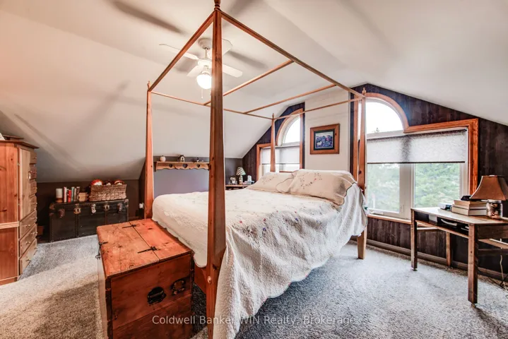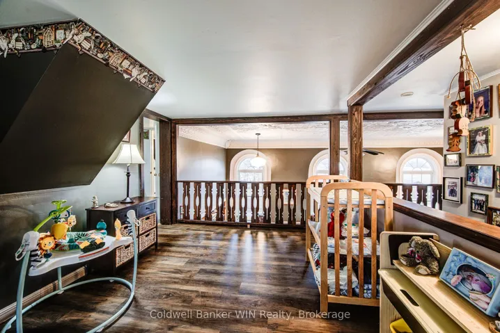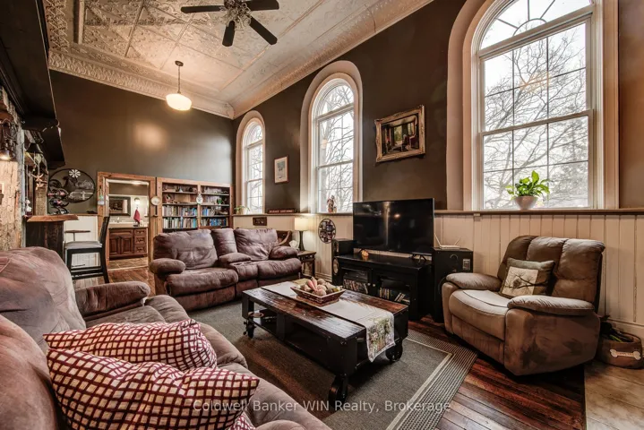 +"PublicRemarks": "Ready to head back to school? This beautifully updated century schoolhouse blends timeless character with thoughtful modern upgrades. As you travel down the picturesque tree-lined driveway, you'll immediately feel the charm of this one-acre property with no close neighbours. The home's striking metal roof, complete with a classic school bell, sets the tone, while the brick and stone exterior remain in excellent condition. Step inside to a well-designed kitchen featuring ample counter space and convenient bar seating ideal for everyday living or entertaining. The formal dining area offers a walkout to the rear deck and patio, seamlessly connecting indoor and outdoor spaces. The living room is truly a showpiece, highlighted by a cozy wood-burning fireplace and soaring 20-foot tin ceilings that capture the character of a bygone era. Upstairs, a loft-style seating area overlooks the main living space below. This level includes two bedrooms, a 3-piece bathroom, and a conveniently located laundry area. The private primary suite on the 3rd floor offers generous closet space and a comfortable sitting area. The full basement features a walkout and presents excellent potential for additional finished living space. Outside, enjoy the thoughtfully designed two-tier deck and patio with multiple seating areas and a hot tub for relaxing or hosting guests. The detached garage provides plenty of room for vehicles, hobbies, and storage. Recent updates include new flooring on the second floor (2026) and a heat pump in the primary suite (2025). This is a one of a kind property and is sure to please. Come back to school and see what benefits it can provide to your future years."