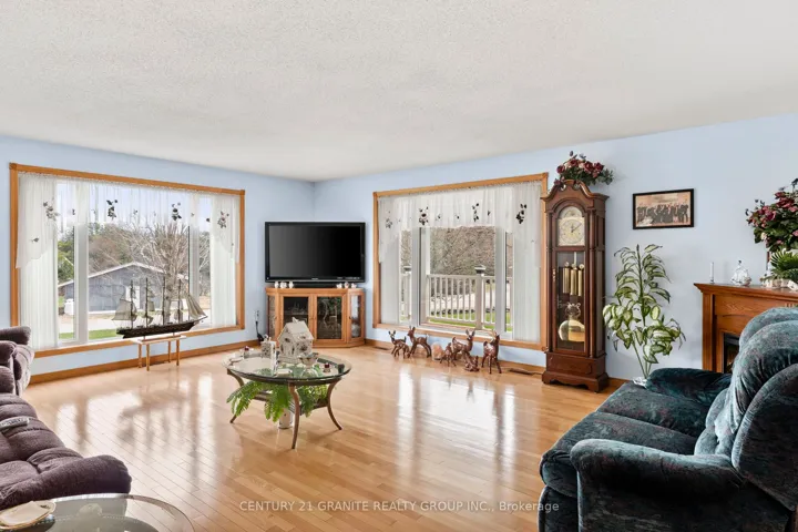 +"PublicRemarks": "An exceptionally built solid brick home set on 1.3 acres! This stunning property features a rare 4-car attached garage. Nicely situated on a large, level lot with clear views of the manicured lawns and gardens. The property boasts a beautifully paved circular driveway that adds a touch of elegance and convenience. Inside, you'll be greeted by large windows that flood the space with natural light, hardwood floors throughout the main living spaces. The custom kitchen has an expansive dining room for those that love to entertain, while the generous living room offers a cozy retreat for relaxation. With 2 main floor bedrooms and 2 full bathrooms and main floor laundry this home is designed for comfortable living at all stages. Plenty of room to expand in the partially finished full basement that adds and additional 1,400 sq ft of living space complete with a cozy wood stove. Only 20 minutes to the town of Bancroft and just minutes away from crown land, lakes."