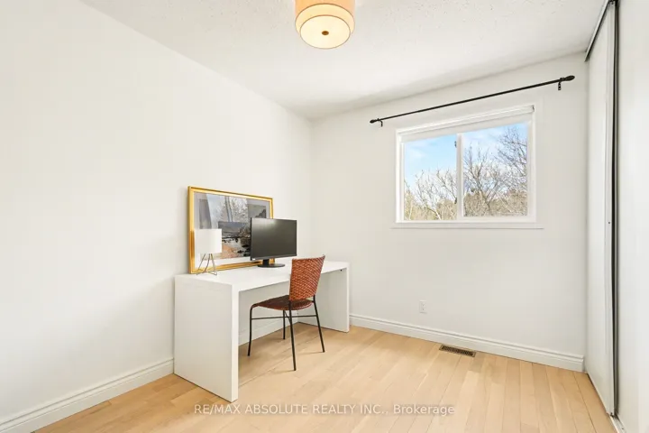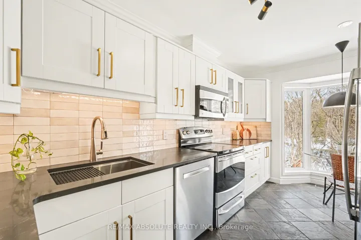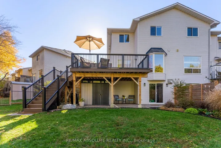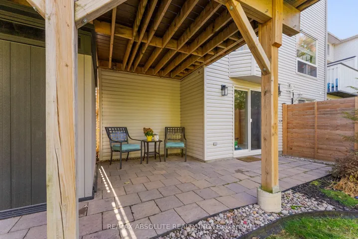 +"PublicRemarks": "OPEN HOUSE Sunday March 29th from 1pm-3pm! Welcome to 23 Riverbank Court-an exceptional Holitzner end-unit townhome set on a premium, fully fenced lot backing onto Poole Creek. This rare offering combines privacy, natural beauty, and extensive updates, all within walking distance to local amenities. Enjoy the outdoors from the spacious second-storey composite deck-an ideal setting to relax and take in the sights and sounds of nature. The beautifully landscaped yard provides a safe and secure space for children and pets to play. Inside, there are tasteful renovations throughout. The main and second levels feature bleached oak flooring, complemented by a hardwood staircase. The main floor boasts a stylish eat-in kitchen with quartz countertops, set against natural slate flooring. A full-length bay window in the breakfast nook frames peaceful, treed views. The dining area offers built-in banquette seating with convenient storage, maximizing both function and style. A welcoming living room and a updated powder room complete the main level. Upstairs, the sun-filled second floor features a primary retreat with a cathedral ceiling, walk-in closet, and a beautifully renovated ensuite. The spa-inspired bathroom includes a large low-threshold shower with rain shower head, ambient lighting, and custom built-ins. Two additional bedrooms offer tranquil views, including one with a Murphy bed. A versatile office or fourth bedroom adds flexibility for modern living. These rooms share a fully renovated main bathroom featuring a deep soaker tub with shower. The bright, walk-out lower level extends the living space with a cozy natural gas fireplace, a laundry/utility area, and storage room. Sliding doors lead to a covered patio, complete with an oversized storage shed. Located in a quiet, sought after cul-de-sac, this home is part of a friendly, established community. It truly offers the best of both worlds: everyday convenience and a private natural oasis in the heart of Stittsville."