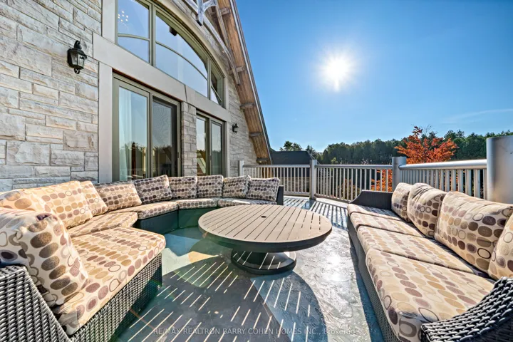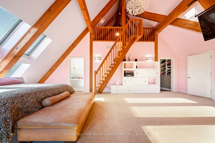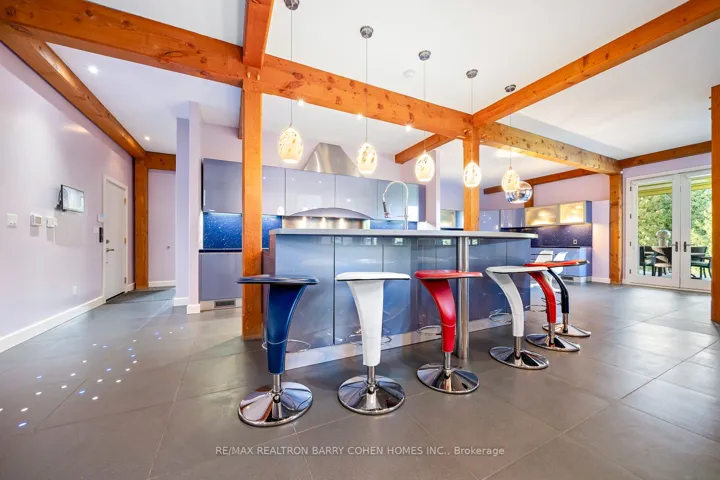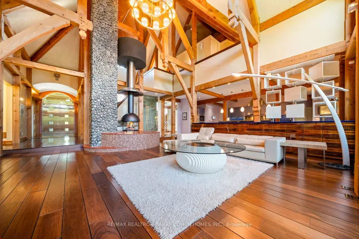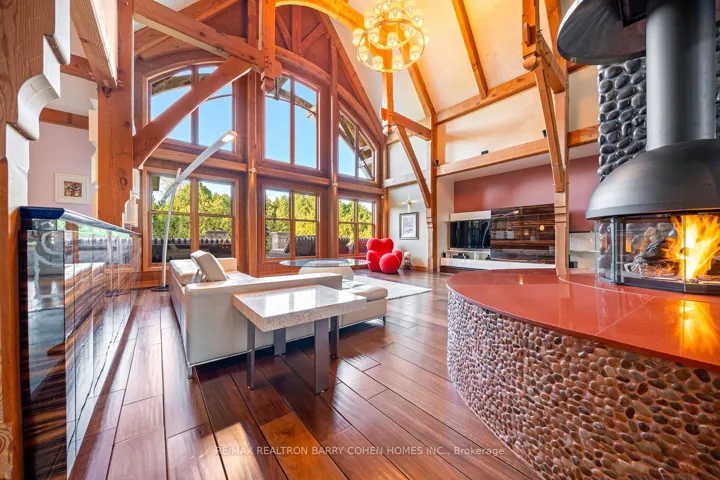 +"PublicRemarks": "This One-Of-A-Kind Residence Was Custom Built By The Owners To Showcase Their Unique Vision, Blending The Chic Allure Of High-End Chalet Design With The Timeless Strength Of Canadian Timber Frame Craftsmanship. A Striking Copper Roof Crowns The Home, While A Dramatic Great Room With Soaring 35-Foot West-Facing Windows And A Circular Gas Fireplace Sets The Tone For Inspired Living. Overlooking This Impressive Space Is A Designer Snaidero Kitchen With Seating For 10, Walkout To The Wraparound Deck, And An Infinity Pool Bordered By Glass Walls. The Main Floor Is Anchored By A Private Office Or Dining Room, And A Bauhaus-Inspired Powder Room With Tile Detailing. The Primary Suite Serves As A True Sanctuary, Featuring Cathedral-Like Beamed Ceilings, Bespoke Poliform His-And-Hers Walk-In Closets, A Luxurious Spa-Like 5-Piece Ensuite. Upstairs, Two Expansive Bedroom Suites With 25-Foot Ceilings Each Enjoy Private Walk-In Closets And Share A Large 6-Piece Ensuite With Loft Areas. The Walk-Out Lower Level Offers A Family Room, Acoustic Music Studio, Private Hair Salon, And Powder Room, Along With Additional Bedrooms For Family Or Guests. Designed With Both Scale And Intimacy In Mind, This Home Balances Contemporary Elegance With Natural Warmth An Irreplaceable Retreat Surrounded By Unmatched Privacy."