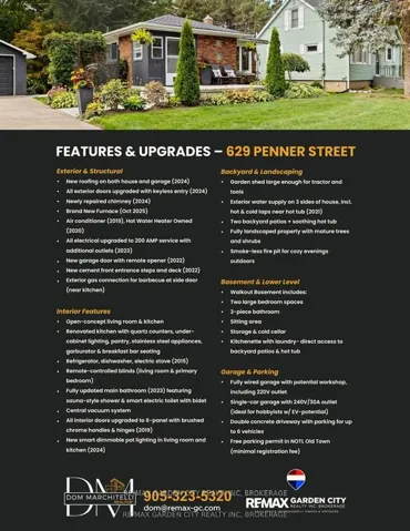 +"PublicRemarks": "Welcome to 629 Penner Street, a charming, updated bungalow in the heart of Virgil - one of Niagara-on-the-Lake's most loved communities. This is not a large home - and that's exactly its appeal. It offers a right-sized, move-in-ready opportunity for the next chapter of life, where lifestyle, simplicity, and location matter more than excess space- all set on a rare 200-foot private lot. Inside, natural light, hardwood floors, and an open-concept layout make daily living easy. The renovated kitchen features quartz countertops, SS appliances, and a pantry, flowing seamlessly into the dining and living areas - ideal for relaxed evenings or entertaining. Two comfortable bedrooms and a fully renovated 3-piece bathroom complete the main level.The lower walkout adds meaningful versatility with additional bedroom space, a sitting area, a second 3-piece bath, and a kitchenette - well-suited for guests, extended family stays, or flexible use as needs evolve.The private 200-foot-deep lot is a standout feature, surrounded by mature trees and offering a peaceful backyard retreat complete with a hot tub and seamless indoor-outdoor connection rarely found in Niagara-on-the-Lake.Virgil offers everyday amenities, while Old Town, world-class wineries, award-winning dining, boutique shopping, farm markets, craft breweries and the Shaw Festival are just minutes away - all without peak-season congestion. Major updates provide peace of mind, including roofing (2024), furnace (2025), 200-amp electrical service (2023), A/C (2019), an owned hot water tank, and a garage currently used as a workshop with a 240V outlet, offering EV potential. Additional features and improvements are detailed in the feature sheet. Ideal for downsizers, empty nesters, second-home buyers, or those seeking lifestyle-forward living in one of Niagara-on-the-Lake's most desirable communities, this thoughtfully updated bungalow offers the opportunity to enjoy less house, more life in a location that simply delivers."