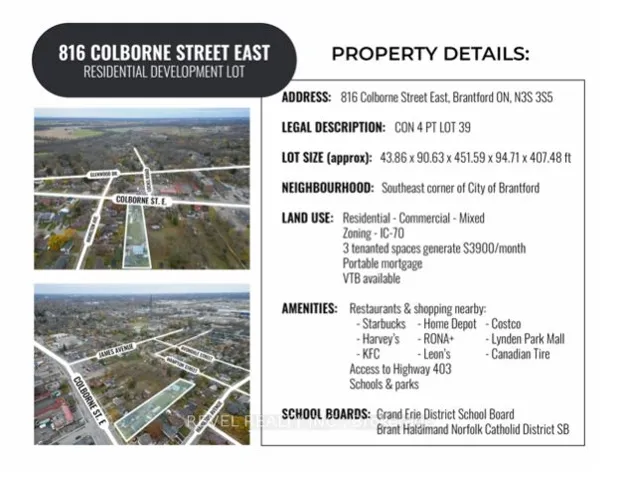 +"PublicRemarks": "ATTENTION DEVELOPERS! Welcome to 816 Colborne Street, Brantford! Nestled in the desirable and family-friendly Echo Place neighbourhood, this property offers the perfect blend of convenience and potential. Situated on an impressive lot measuring approximately 43.86ft x 90.63ft x 451.59ft x 94.71ft x 407.48ft, this residential gem is part of Brantford's Intensification Corridor, providing excellent opportunities for future growth. Under the new zoning by-laws with the City of Brantford, the lot will accommodate a total buildable footprint of 10,167 square feet, with a height of 38 meters. Amenities abound with shopping centres, big-box stores, and a variety of restaurants just moments away along Wayne Gretzky Parkway and Colborne Street. In proximity to schools and parks, as well as easy access to Highway 403! Serviced by the Grand Erie District School Board and the Brant Haldimand Norfolk Catholic District School Board, this property perfectly suits future families seeking a community atmosphere."