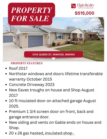 +"PublicRemarks": "Experience breathtaking sunsets and a relaxed country lifestyle in this charming home located in the quiet hamlet of Inwood. Tucked away on a peaceful dead-end street, this all-brick ranch sits on a generous lot offering both privacy and space. Step onto the front porch and enter a warm, inviting interior featuring tranquil tones and stylish updates, including shiplap and wainscoting accents. The spacious living room flows seamlessly into the kitchen, complete with a dining area and a beautiful butcher block island-perfect for everyday living and entertaining. Just off the kitchen, you'll find a convenient mudroom with laundry. Down the hall are two generously sized bedrooms and a well-appointed 4-piece bathroom. The basement offers a blank canvas, ready for your personal touch and future development. The attached garage is equipped with a 10-foot insulated overhead door (2025), and doesn't freeze with all the extra insulation blown into the walls and the attic -ideal for larger vehicles or hobby use. Outdoors, enjoy a rear deck with a gazebo, plenty of space for entertaining, a partially fenced yard, raised garden beds, two storage sheds, and an impressive 20' x 28' insulated, gas-heated (smart thermostat) shop-perfect for projects or additional workspace. All of this, just 30 minutes from Strathroy and 25 minutes to Wardsville Golf Course."