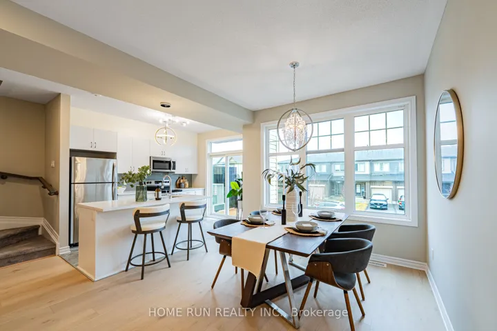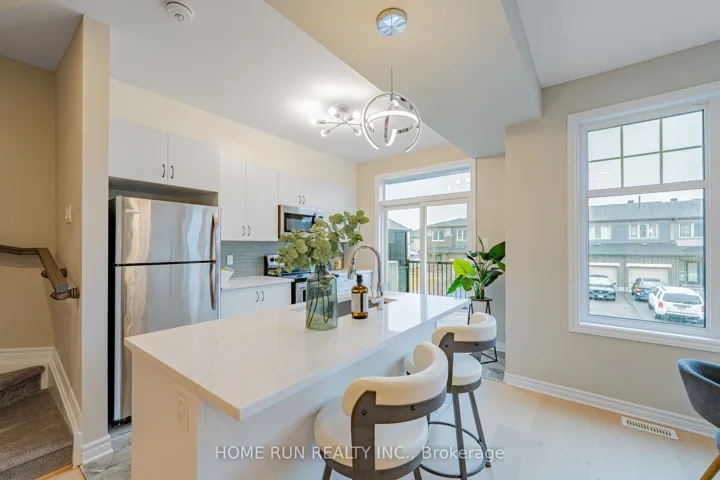 +"PublicRemarks": "Welcome to a well-designed and beautifully upgraded 3-storey townhome in Minto's Harmony community in Barrhaven! The south-facing orientation fills the home with natural light throughout the day. The ground floor features a spacious foyer with access to an extra-deep single-car garage, and a conveniently located laundry room - situated away from the upper bedrooms for a quieter living experience. The open-concept second floor is bright and welcoming, with 2.74 m ceilings, large windows and a thoughtful layout connecting the living room, dining area, and kitchen. The modern kitchen is finished with high-end Calacatta Gold quartz countertops, a tiled backsplash, stainless steel appliances, a deep upper cabinet above the fridge, and a full gable panel beside the fridge - a clean, polished look throughout. The kitchen flows into the dining area and opens onto a south-facing balcony, ideal for outdoor relaxation. Wide plank 19 cm engineered hardwood flooring and upgraded light fixtures are found throughout the second and third levels. On the third floor, the primary bedroom features a spacious walk-in closet and a private door directly to the main bathroom - a thoughtful upgrade for added privacy and convenience. A well-sized second bedroom comfortably fits a queen bed and serves equally well as a guest room or home office. Conveniently located close to Barrhaven Centre (4 min), Costco (7 min), Walter Baker Sports Centre (6 min), and HWY 416 (7 min), with nearby access to a public French secondary school and Ottawa Christian School."