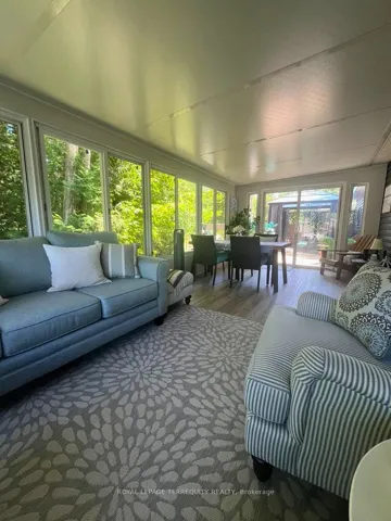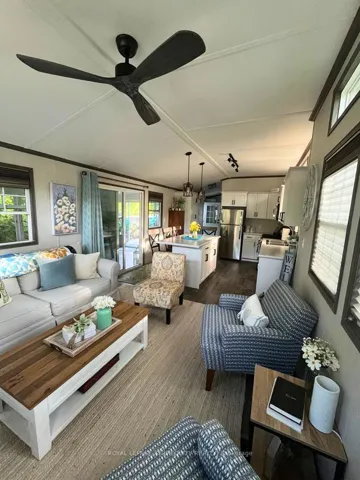 +"PublicRemarks": "Turnkey 2-bedroom seasonal retreat on a premium private ravine-backed lot in the highly sought-after Pioneer Point community, offering the perfect balance of privacy and vibrant resort living. This impeccably maintained 2019 General Coach Manchester model includes a bright 23' x 11' sunroom addition, stainless steel appliances (2024), modern lighting, Moen and Kohler fixtures, and stylish high-end furnishings throughout. The outdoor space is designed for entertaining and relaxation with a Large Deck (45') + 120' patio + 30'x11' hardtop gazebo, fire pit, Weber BBQ, and beautifully landscaped grounds, all surrounded by mature trees with only one neighboring property. Inside features two bedrooms including a queen and double bunk configuration with a Douglas mattress (never been used), plus central air, furnace heat, electric fireplace, and a fully equipped kitchen with island. Pioneer Point Resort is a vibrant, family-friendly gated community offering a wide range of amenities, including two heated pools, a private sandy beach, pickleball courts, beach volleyball, horseshoe pits, a bouncy pillow, kids club, and weekly summer events for all ages. The resort operates seasonally from May 8th to October 25th, providing a low maintenance summer lifestyle. Optional dock rentals are available, with convenient access to nearby beaches, shopping, dining, and local attractions. With 2026 park fees of $6,250 + HST and $300 hydro deposit already paid, this fully furnished property is a rare, move-in-ready opportunity for a carefree seasonal escape."