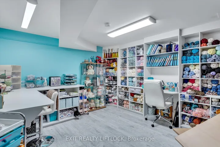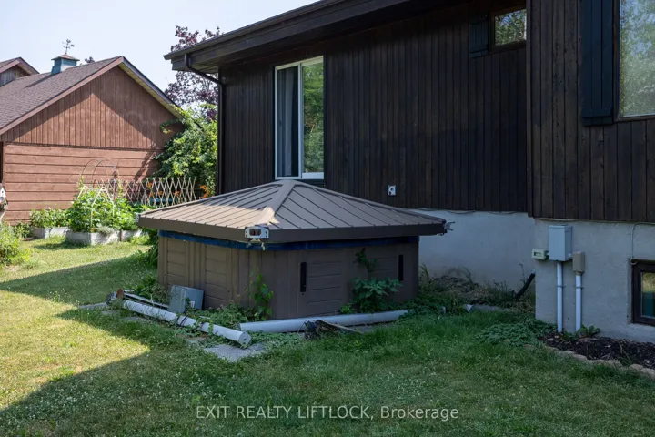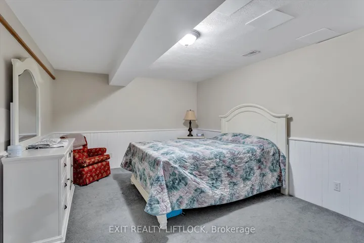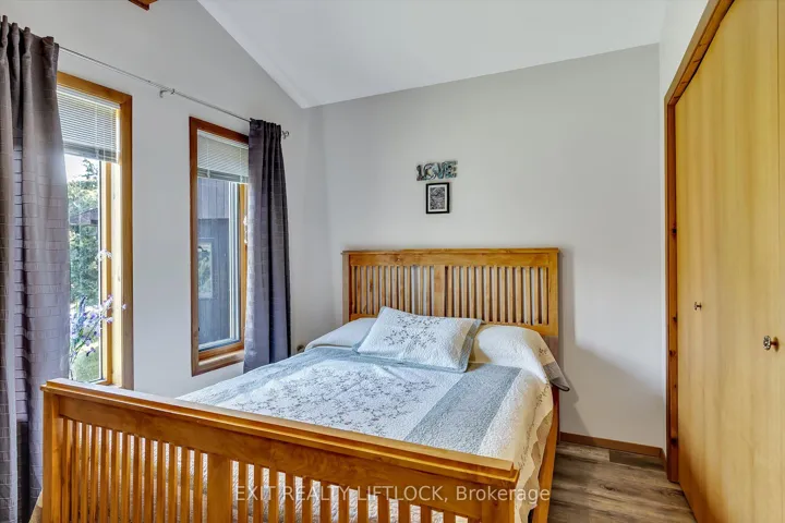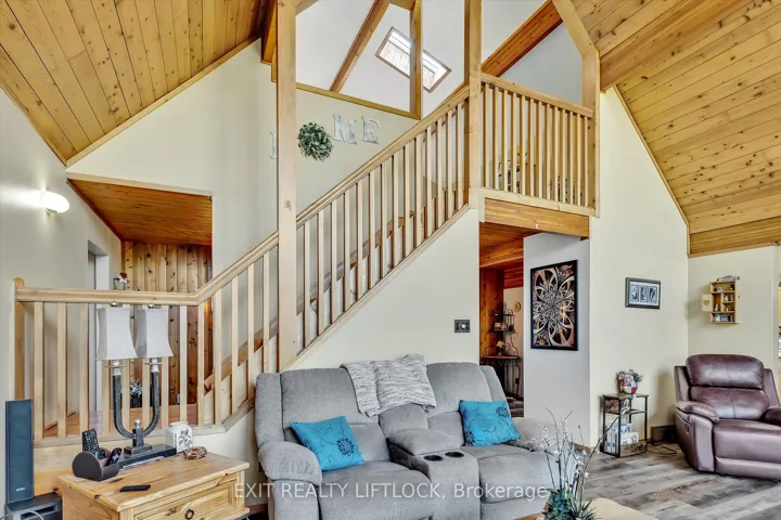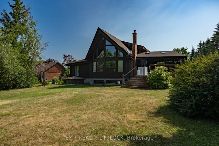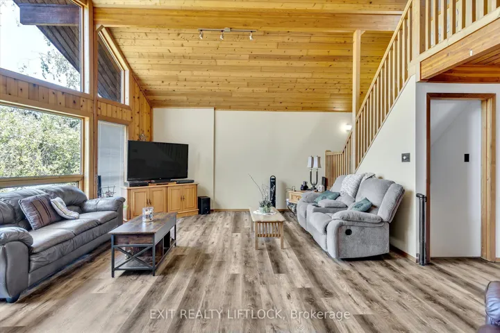 +"PublicRemarks": "WOW! A great room with cathedral ceiling and a literal wall of windows. This wood house is a pleasure to show. Natural light pours in with the high ceilings and you capture an amazing sense of space. Next to the great room is the kitchen with a large island and built-in appliances. Sky-lights allow additional natural light, with a patio door leading to a covered rear deck. The main floor laundry/pantry has an exit to the side yard. The roomy primary bedroom has a 3pc ensuite with heated flooring, and a patio door to the rear yard. The loft overlooking the great room is set up as an office, but with it's 2pc bath would be a comfortable bedroom. In the lower level is a rec room with laminate floors and a pellet stove. Downstairs you will find a 4th bedroom, den, workshop/craft room and utility room. There is an oversized double detached garage with hydro and pellet stove. The property has a large lot that allows for many options for family fun. The property belongs to an Association with access to a private waterfront park with available docking. Annual fee is $200."