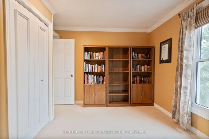 +"PublicRemarks": "Rare end-unit townhome in Oakridge offering a large layout with 5 bedrooms (4+1) and 4 bathrooms. This traditional two-storey home features a bright main floor with hardwood flooring, a spacious living room with a gas fireplace, and an updated kitchen with custom cabinetry, an added window, and heated tile floors. A formal dining area and convenient powder room complete the main level, with crown moulding adding a refined touch throughout. Upstairs includes four generous bedrooms, including a primary suite with a walk-in closet and ensuite, along with an updated second bathroom featuring heated floors and an additionally installed window for more natural light. The fully finished basement offers excellent in-law or income potential, complete with a large living area and second gas fireplace, bedroom with roughed-in kitchenette, and a full bathroom. Enjoy both front and back patios, a single-car garage, and a quiet, walkable location close to parks, amenities, and the Thames Valley Golf Course"