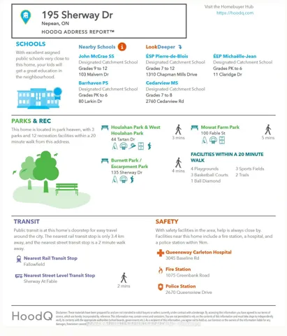 +"PublicRemarks": "Welcome to 195 Sherway Drive, a beautifully updated 3-bedroom townhome in the heart of Barrhaven, offering stylish upgrades, flexible living space, maintenance-free front and back yards, and a fantastic location close to everything a family needs. Step inside through the tiled foyer with elegant French door entry. Brand new laminate flooring and a wood-burning fireplace create a warm and inviting living room. Patio doors lead directly to the backyard deck, extending your living space outdoors. The updated kitchen is both functional and stylish, featuring stainless steel appliances, built-in ovens, a gas range, and generous cabinetry. A breakfast bar with seating for four makes this the perfect hub for casual meals. A convenient 2-piece powder room completes the main level. Upstairs, brand new carpeting adds comfort throughout the bedroom level. The spacious primary bedroom offers a peaceful retreat, while two additional bedrooms provide excellent space for children, guests, or a home office. A well-appointed 4-piece bathroom serves the second floor. The finished basement expands the home's living space with a versatile family or recreation room featuring laminate flooring and a second gas fireplace. A large unfinished utility room provides abundant storage, and the lower level also includes a dedicated laundry area. Outside, the fully fenced backyard is designed for enjoying Ottawa's warmer months, with an interlock patio, raised deck, storage for kayaks and gazebo-perfect for outdoor dining, entertaining, or simply unwinding in a private setting. Additional highlights include an attached single-car garage and the convenience of a vacant property with immediate possession available. Located in a sought-after Barrhaven neighbourhood close to schools, parks, shopping, and transit, this move-in ready home is an excellent opportunity for families, first-time buyers, or investors alike. Don't miss your chance to see it!"