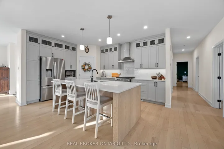 +"PublicRemarks": "Set on a dead end road in Tay Valley, this beautifully finished 3+1 bedroom, 3 full bathroom bungalow offers the perfect blend of modern comfort and natural serenity, all just 5 minutes from the charming town of Perth. The striking exterior, oversized driveway, 3 car garage and over 2 acres lot offer space to breathe and room to grow. Brighten every season with professionally installed Gemstone lighting. Inside, the home opens into a bright, airy layout with warm hardwood floors, large windows, and thoughtfully designed living spaces that feel both welcoming and refined. The heart of the home is the open-concept kitchen, dining, and living area, ideal for everyday living and effortless entertaining. The kitchen features an expansive island, ample cabinetry, a pantry and clean modern finishes. The living room invites you to unwind beside the fireplace, with natural light pouring in from every angle.The primary bedroom is a true retreat, complete with serene views, a calming colour palette, and a spa-inspired ensuite with a double vanity and walk-in shower. Additional bedrooms are generously sized and versatile, perfect for family, guests, or a home office.Downstairs, the fully finished walkout basement adds incredible living space, anchored by a cozy wood stove that makes it the perfect place to relax on cooler evenings. With an additional bedroom, full bathroom, and direct access to the backyard, this level is ideal for guests, extended family, or recreational use.Backing directly onto conservation land, the backyard offers unmatched privacy and a peaceful natural backdrop. Whether you're enjoying morning coffee on the deck or taking in the quiet of the surrounding woods, this is a place where life slows down in the best way. Combining modern finishes, flexible living space, and a truly special setting, this home offers the best of country living with the convenience of town just minutes away."