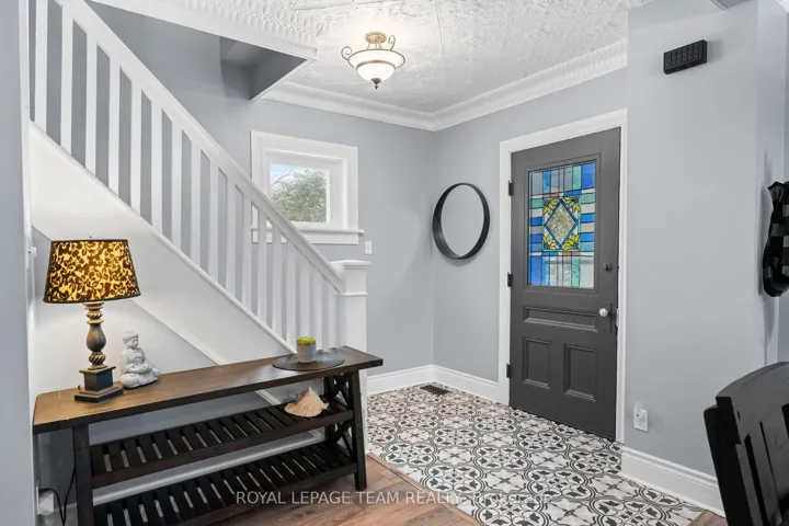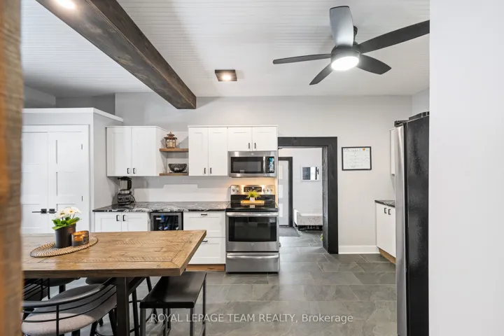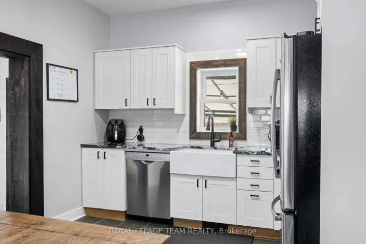 +"PublicRemarks": "Beautifully renovated home blending modern upgrades with timeless character, ideally situated on a desirable corner lot. Extensive improvements since 2020 include all new flooring throughout, fresh neutral paint, updated lighting, and widened interior doorways with modern 4-panel doors and hardware. The main floor features a fully redesigned kitchen with GE stainless steel appliances, granite countertops, white shaker cabinetry, subway tile backsplash, LED pot lighting, and a 32" farmhouse sink. Original 1920 tin ceilings and crown moulding have been refinished in crisp white, adding charm and character. A convenient mudroom addition off the kitchen offers additional storage and access to the backyard, along with a stylish black steel entry door. Upstairs, the second floor includes a renovated full bathroom with new plumbing, a large porcelain tub with full-height tile surround, new vanity and toilet, plus a custom barn board accent wall. The primary bedroom features a newly created walk-in closet. The third floor offers additional living space with updated laminate flooring. Step outside to enjoy a fully fenced yard with double gate access from the street, perfect for trailers, equipment, or added convenience. A standout feature is the authentic original barn with loft, ideal for a workshop, hobby space, or at-home business setup. Additional updates include armour stone front steps, refinished staircases on all three levels, interior barn doors, updated half bath with full-size stackable laundry and new mechanicals including furnace (2024), hot water tank (2020, gas), air conditioning (2020) and sand point well (2025). Windows were previously updated (approx. 2013). Located within walking distance to the public school, post office, and general store, and just a 2-minute drive to the grocery store, this home offers the perfect blend of small-town convenience and modern living.All measurements as per Iguide Floorplan. Buyer to confirm all room sizes."