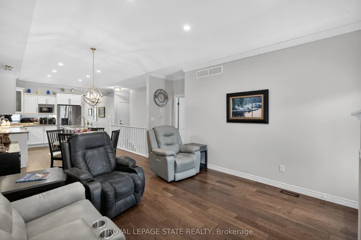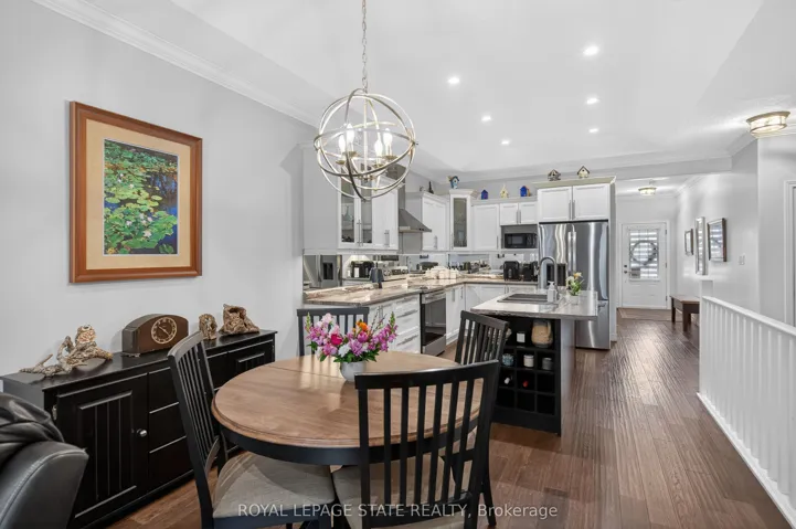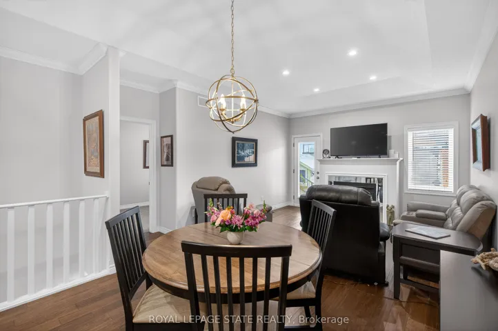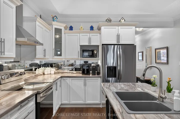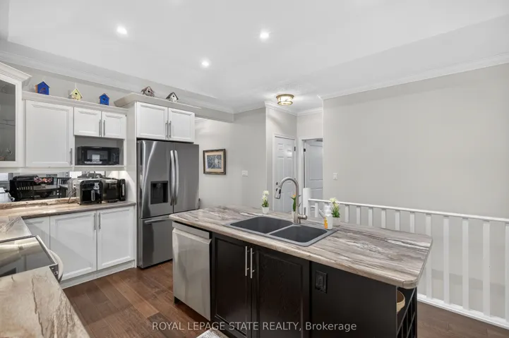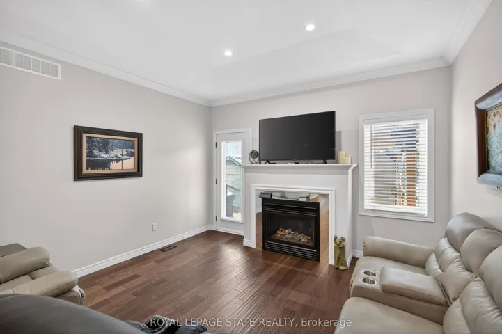 +"PublicRemarks": "Premium end-unit freehold townhome in the vibrant City of Brantford. Beautifully appointed and meticulously maintained, this 2+1 bdrm, 2 bath residence offers an exceptional blend of style, comfort, & convenience. From the moment you arrive, the home's striking facade featuring stone, stucco, and brick creates a lasting first impression, complemented by tasteful landscaping and a covered front porch. A spacious foyer welcomes you inside, complete with an oversized storage closet and a versatile front bdrm currently used as a home office. The heart of the home showcases an open-concept design, anchored by a spacious kitchen w/ upgraded white cabinetry, mirrored backsplash, S/S appliances including a new LG fridge & dishwasher ('24), undermount lighting, & a centre island w/ breakfast bar seating. A separate formal dining area flows seamlessly into the large liv rm, highlighted by a cozy gas FP & walkout to the private rear yard. The main lvl primary retreat offers ensuite privileges to a beautifully finished 4-pc bath, along w/ the convenience of main flr laundry. The f-fin lower lvl expands your living space w/ a generous rec rm feat an electric FP, a 3rd bdrm, & a 3-pc bath w/ an oversized glass walk-in shower. Step outside to enjoy a thoughtfully designed backyard complete with a pergola, privacy screens, sunshade, concrete patio, gas line for BBQ, storage shed, and grassy area. Noteworthy upgrades include updated lighting fixtures, LED pot lighting throughout the kitchen, dining, and living areas, garage door, laundry room cabinetry, and fresh paint on the main level. Crown moulding & hardwood flooring add a refined finish throughout. Located in a sought-after neighbourhood, this home offers easy access to parks, scenic trails, schools, shopping, and everyday amenities. Commuters will appreciate proximity to Hwy 403, while families benefit from a welcoming community atmosphere and nearby recreational facilities. A perfect balance of lifestyle and location."