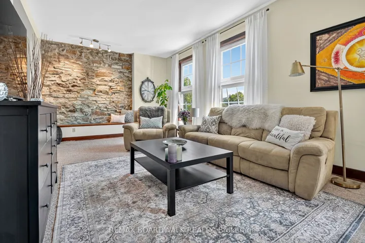 +"PublicRemarks": "Set within the iconic Boulton Brown Mill, one of Carleton Place's most treasured heritage buildings, this rare residence offers an unmatched blend of character, tranquillity, and downtown convenience, all perched directly along the Mississippi River. From the moment you step inside, you're greeted by a bright, open-concept living space where exposed stone walls, soaring 9-foot ceilings, and oversized windows create a warm yet airy atmosphere. Natural light pours in while the river setting provides a constantly changing backdrop of lush greenery and flowing water. The kitchen is both practical and inviting, featuring generous cabinetry, a walk-in pantry/storage room, and in-suite laundry, while a stylish 2-piece powder room adds convenience for guests. Upstairs, both bedrooms are positioned to fully embrace the setting, each offering peaceful views of mature trees and the river beyond, creating a true sense of escape. The primary bedroom is a standout retreat, complete with a private walk-out balcony overlooking the water, where you can enjoy your morning coffee or unwind in the evening with the cool breeze off the river in the summer months. This is where lifestyle meets location-steps to downtown Carleton Place's boutique shops, cafés, and restaurants, yet surrounded by scenic walking paths and the calming presence of the water. This rare opportunity includes one parking space and a large dedicated storage unit. You can own a piece of history while enjoying serene waterfront living in the heart of town."