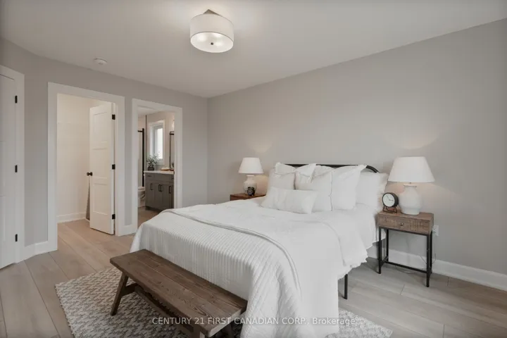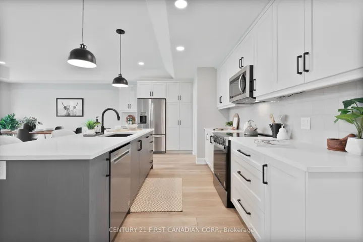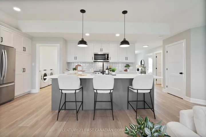 +"PublicRemarks": "NEW GOVERNMENT REBATES - MOVE IN READY - Appliances Included - The James Model by Colden Homes is a beautifully crafted 1,350 sq ft bungalow that blends style and function, offering the perfect balance of elegance and practicality for those seeking a comfortable, low-maintenance lifestyle. Whether you're downsizing or starting a new chapter, this home is designed to meet your needs while creating a warm, welcoming environment. The open-concept main floor features a generous great room that flows seamlessly into the dinette and kitchen, creating an ideal space for both everyday living and entertaining. The kitchen is spacious and thoughtfully designed, complete with a large island that comfortably seats four, ample countertop space for meal prep, and high-quality cabinetry that extends to the ceiling-making it the true heart of the home. The primary suite offers a peaceful retreat with a walk-in closet and a well-appointed 3-piece ensuite. A second bedroom, full bathroom, and convenient main floor laundry provide added comfort and functionality for family or guests. The lower level extends your living space with a finished rec room, a third bedroom, and a 4-piece bathroom-perfect for guests, a growing family, or a private retreat-while still offering a large unfinished storage area for future use. Upgrades include a tiled ensuite shower, luxury vinyl plank flooring in the bedrooms, extended-height kitchen cabinetry, and upgraded board and batten exterior detailing and a finished basement. Located in Ausable Bluffs, you're just 20 minutes to north London, 15 minutes to Strathroy, and 25 minutes to the beautiful shores of Lake Huron. List price reflects the anticipated benefit of a proposed Government HST rebate (not yet enacted). HST included with all applicable rebates assigned to the Builder. Price is contingent on Buyer eligibility and rebate implementation."