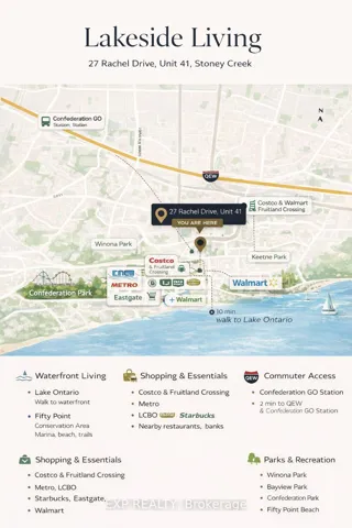 +"PublicRemarks": "Stylish Freehold Townhome Just Steps to Lake Ontario! Welcome to 27 Rachel Drive, Unit 41, a modern, carpet-free 3-storey freehold townhome built in 2022, ideally located in Stoney Creek's sought-after Community Beach neighborhood. Offering 1,358 sq. ft. of bright, functional living space, this home features 2 bedrooms + loft, 1.5 bathrooms, and a thoughtfully designed layout perfect for today's lifestyle. Step inside to a welcoming foyer with a versatile main-floor flex space, ideal for a home office, gym, or cozy retreat. Enjoy the convenience of a private driveway, attached garage, providing both parking & additional storage. Maintenance free turf front lawn provide ultimate convenience & curb appeal with no mowing required. The sun-filled open-concept second level is designed for everyday living & entertaining, featuring 9-ft ceilings, large windows, & modern laminate flooring throughout. The contemporary kitchen offers stainless steel appliances, ample cabinetry, breakfast bar, seamlessly flowing into the living and dining area with walkout to your private balcony, perfect for morning coffee or evening unwind time. Upstairs, you'll find a spacious primary bedroom with a walk-in closet, a generous second bedroom, and a flexible loft space. Perfect as a home office, reading nook, or media area. Upper-level laundry and a well-appointed 4-piece bath complete the top floor. Location is everything. Just steps to Lake Ontario, enjoy nearby waterfront trails, parks, and the beauty of Fifty Point Conservation Area & Marina. Minutes to Costco, shopping, dining, and everyday essentials, with quick access to the QEW, making commuting to Toronto or Niagara effortless. Freehold ownership with no condo fees, modern finishes, and a low-maintenance lifestyle, all in a growing lakeside community. An exceptional opportunity for first-time buyers, downsizers, or investors. Don't miss your chance to own in one of Stoney Creek's most desirable locations."