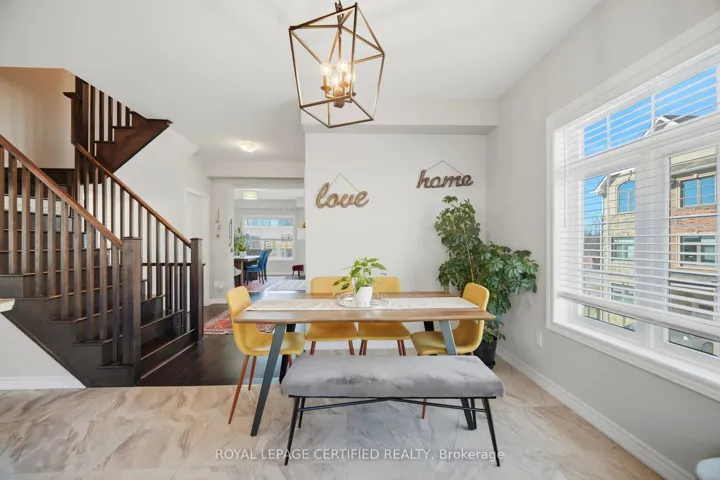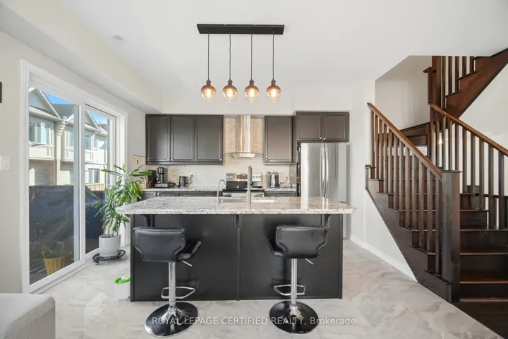 +"PublicRemarks": "A hard-to-find end-unit 4-bedroom (one flexible room on the main level) townhome by Hobin Architecture and Uniform Developments, nestled in the prestigious Richardson Ridge Phase 4 community in Kanata Lakes, surrounded by green space corridors and the Kizell Pond conservation area. Situated on a rare oversized corner lot measuring about 31' wide, this home has no rear easement - offering exceptional backyard privacy that most townhomes cannot match. The landscaped front yard, fully fenced backyard, and side hedges are already in place. Uniform's Carling model offers close to 2,300 sq ft above grade, plus a fully finished basement. The open-concept main floor impresses with hardwood flooring, no visible load-bearing posts or walls, and a bright front-facing flexible room that can serve as a home office, playroom, or guest bedroom. The chef's kitchen features full-height shaker-style cabinetry, upgraded quartz countertops, a Bosch appliance suite including a gas cooktop and flush-mounted double wall oven, a large island with seating, and a charming coffee station. The living room is anchored by a gas fireplace with granite surround and picture-style mantel. The designer oak-and-black-metal staircase is a statement feature. Upstairs, the primary suite (13'4" x 15'0") includes a generous walk-in closet and a heavily upgraded ensuite with oversized tiles, a floating vanity, and quartz countertops. Two additional bedrooms and a full bath complete the second floor, along with conveniently located laundry. The finished basement offers an oversized recreation room (18'7" x 19'9"), a full bath, and a large egress window. Steps to parks, trails, top schools including Earl of March SS, and all amenities Kanata has to offer."