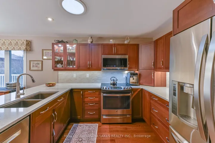 +"PublicRemarks": "Beautifully appointed 2+2 bedroom raised bungalow in one of the north end's most desirable, family-friendly communities. Surrounded by mature trees, walking trails, and greenspace, this location offers quiet, low-traffic living just minutes to schools, shopping, and Trent University. This well-maintained home features a bright, oversized windows, and quality finishes throughout. The kitchen is thoughtfully designed with upgraded cabinetry, granite countertops, under-cabinet lighting, backsplash, stainless steel appliances. The main level offers a spacious primary bedroom with a well-appointed ensuite, an additional bedroom, full bathroom, The fully finished lower level provides excellent additional living space with a large rec room with a gas fireplace, two bedrooms, a full bathroom, and ample storage-perfect for guests or multi-generational living. Step outside to a private backyard retreat with an expansive deck, complete with added lighting and power for entertaining. Backing onto mature trees and a peaceful creek setting, this property offers a rare sense of privacy and connection to nature. Additional features include an attached double garage, natural stone entry, natural gas BBQ hookup, 200 amp service with Generlink, and extensive landscaping. A turn-key home offering comfort, quality, and an exceptional north end lifestyle. Security System monitored by Trent Security, new main floor hardwood 2022, New furnace 2022 ,New AC 2022,Upgraded insulation 2023"